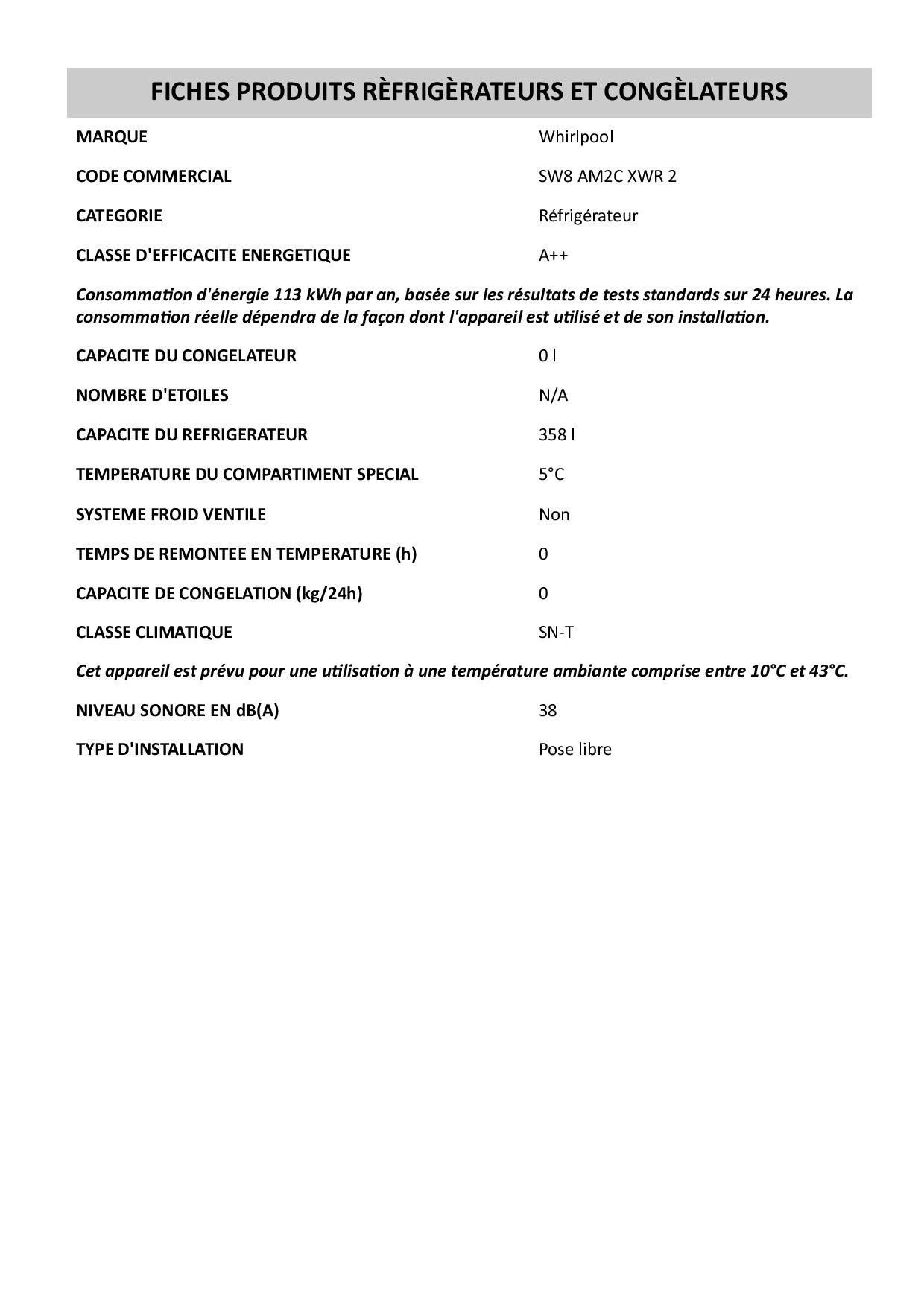 Libellé Whirlpool SW8 AM2C XWR 2 réfrigérateur Pose libre 359 L Acier inoxydable