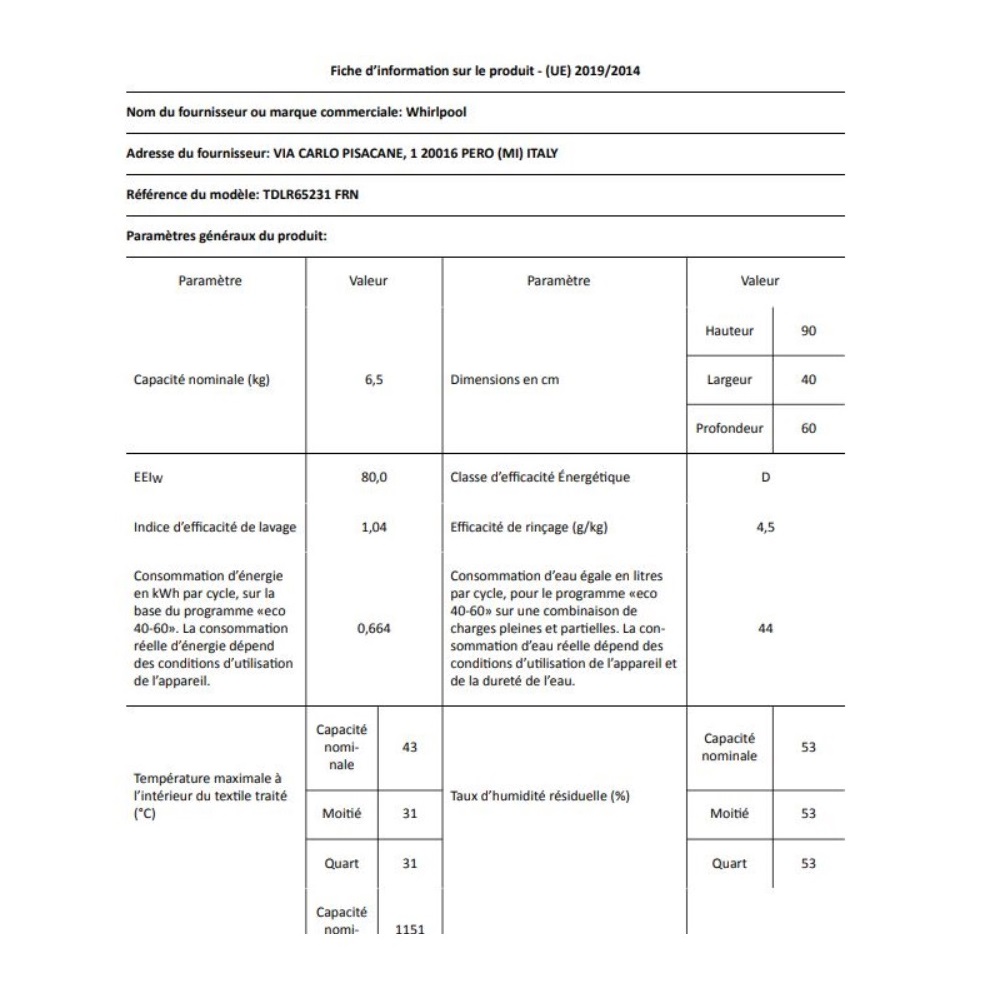 Whirlpool TDLR65231FRN. Type de chargement: Charge par dessus. Capacité nominale: 6,5 kg, Classe d'efficacité d'essorage: B, Niveau sonore (essorage): 77 dB, Niveau sonore (lavage): 58 dB, Vitesse d'essorage maximale: 1200 tr/min. Consommation d'eau annuelle: 8800 L. Couleur du produit: Blanc. Largeur: 400 mm, Profondeur: 600 mm, Hauteur: 900 mm. Classe d'efficacité énergétique: D