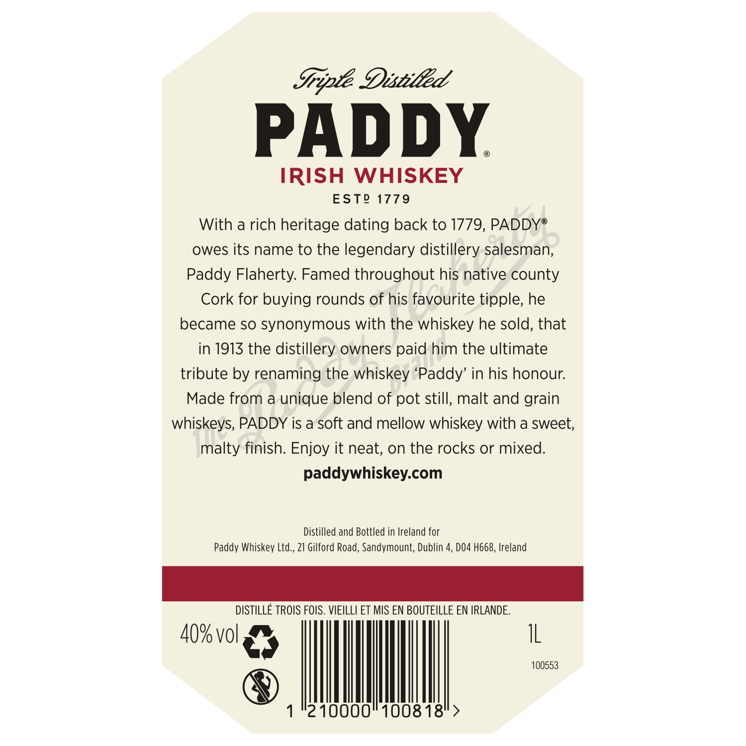 | Libellé | Whisky Blended Malt Paddy - IRLANDE, 40 % vol. - 1 L |