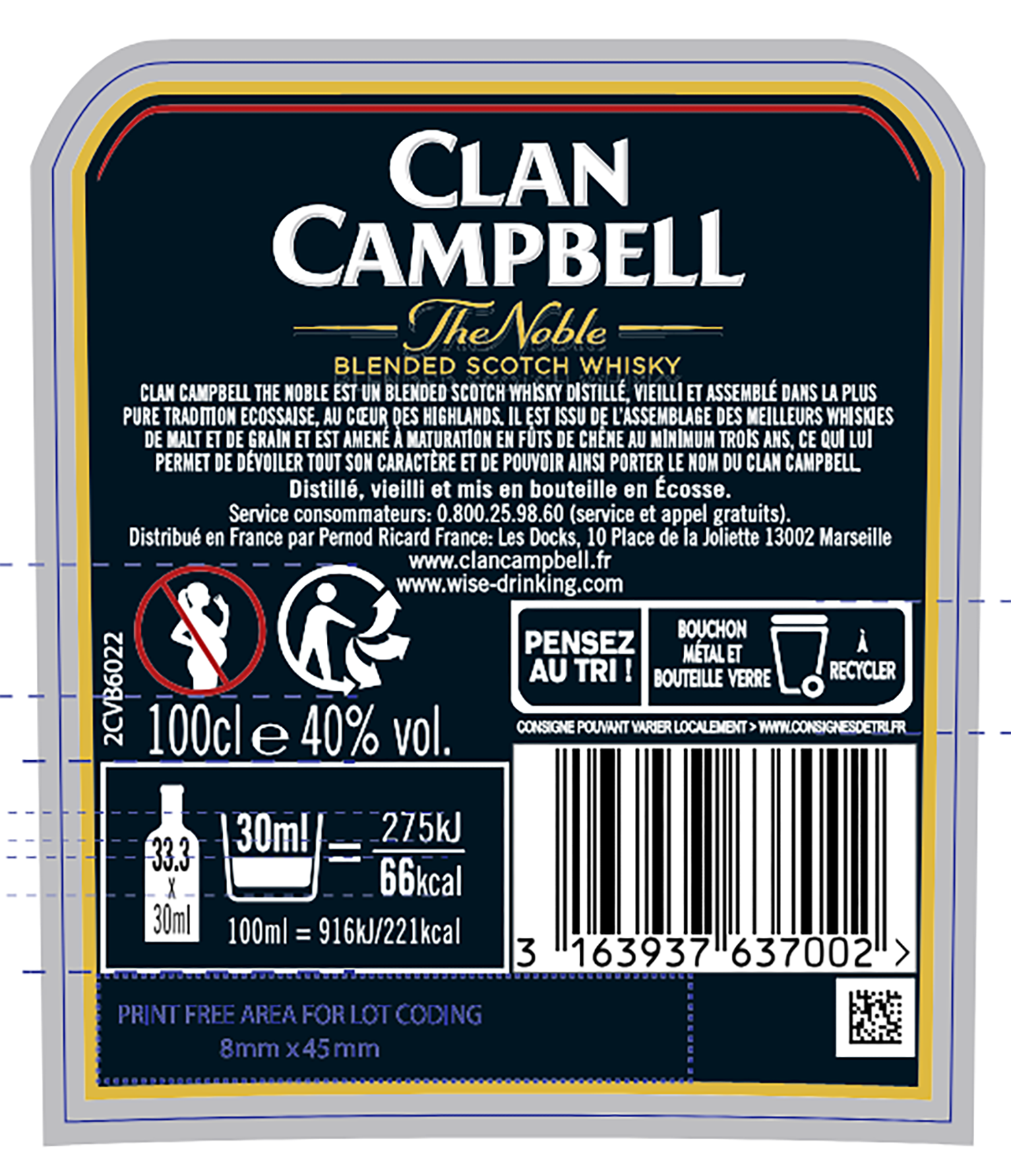 | Libellé | Whisky Blended whisky Clan Campbell - Ecosse, 40 % vol. - 1 L |
