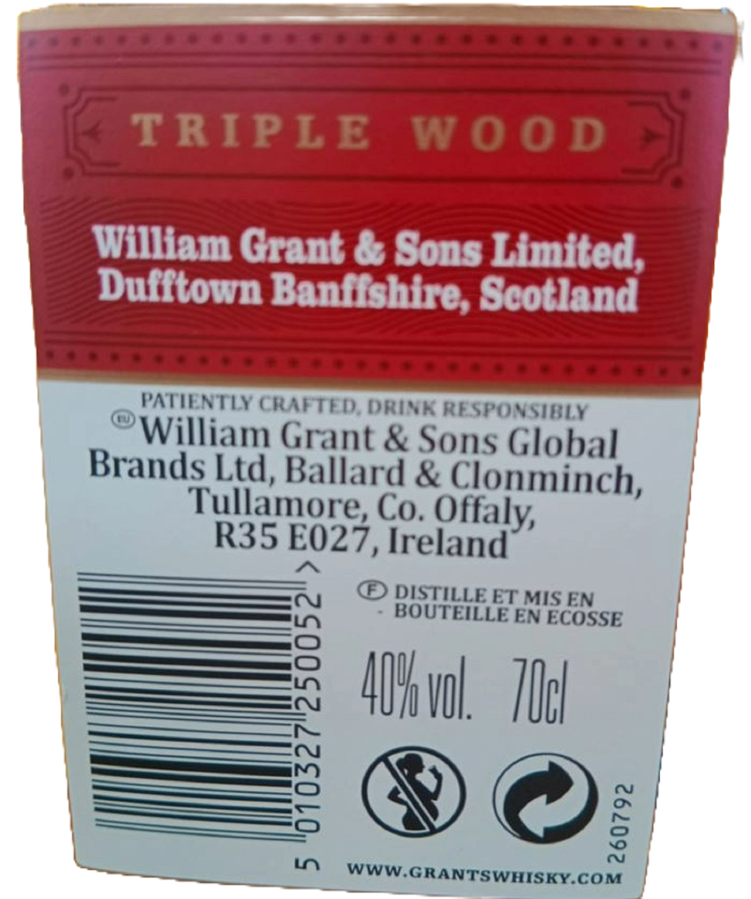 | Libellé | Whisky Blended whisky Grant's Grant's Triple Wood - Ecosse, 40 % vol. - 70 cl |