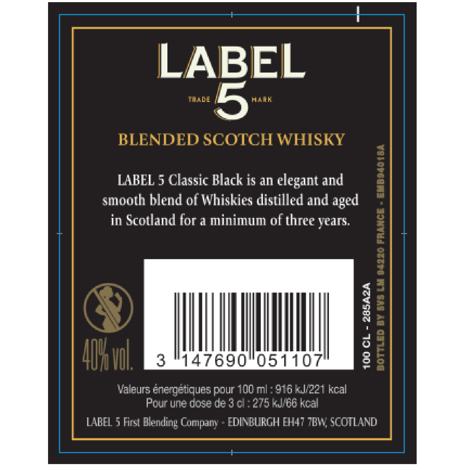 | Libellé | Whisky Blended whisky Label 5 Classic BlackLabel 5 - Ecosse, 40 % vol. - 1 L |