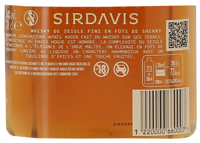 Libellé Whisky Blended whisky SirDavis - Etats Unis, 44% vol. - 70 cl
