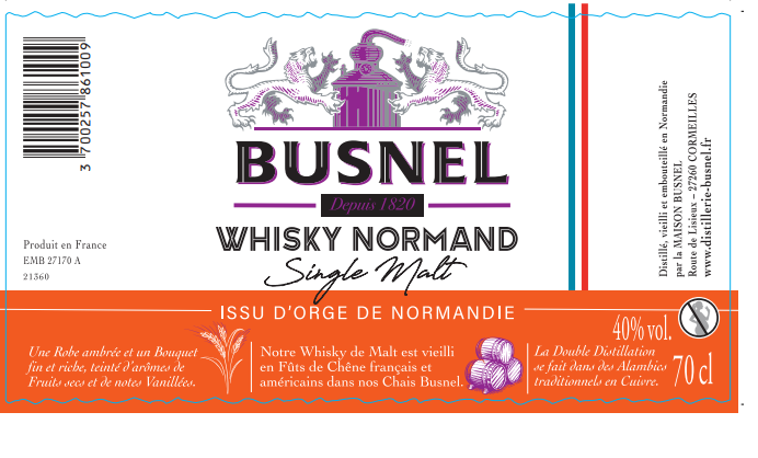 | Libellé | Whisky Single Malt Busnel - France, 40 % vol. - 70 cl |