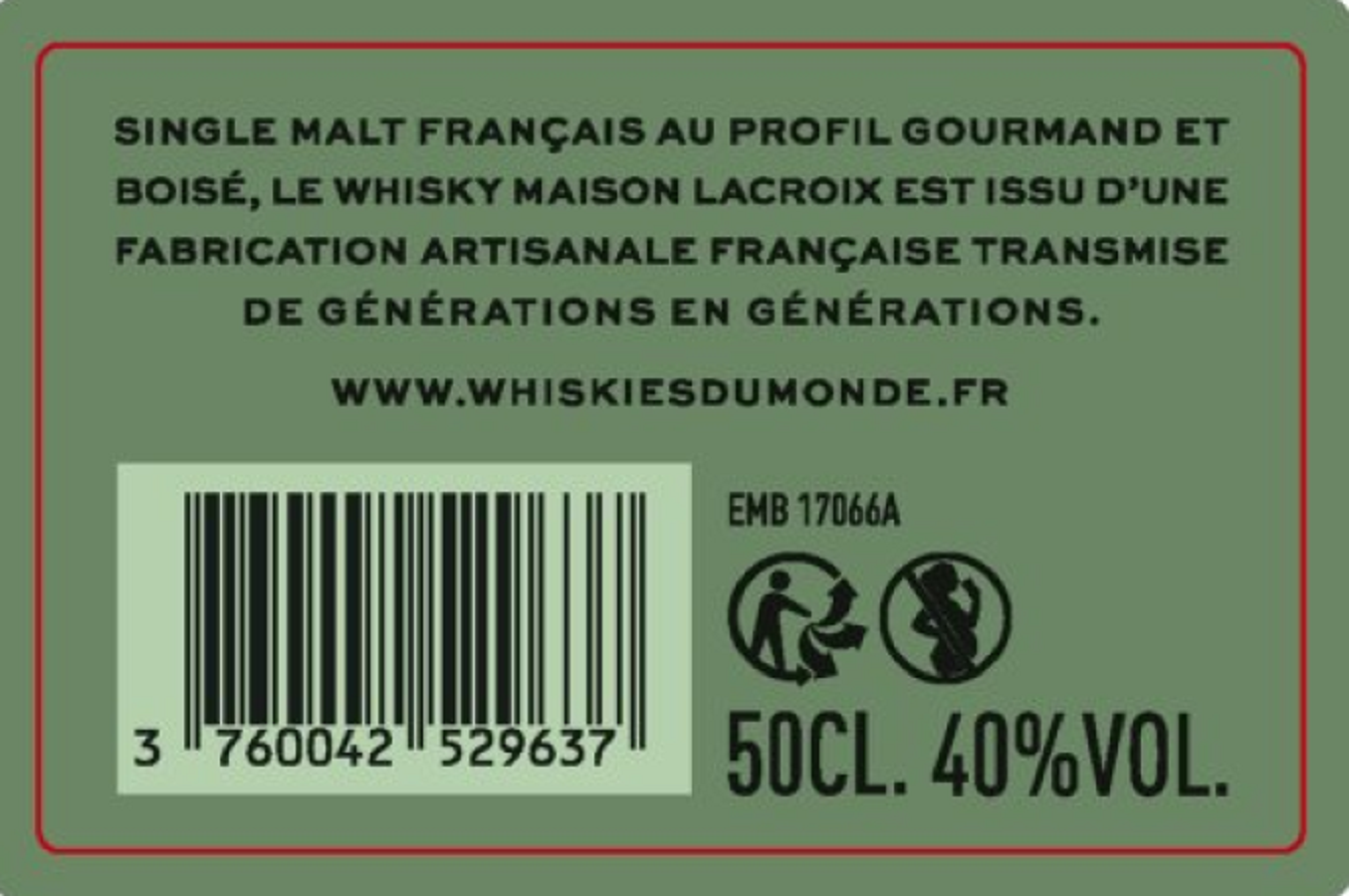 Libellé Whisky Single Malt Maison Lacroix Whisky maison lacroix 50cl 40° - France, 40 % vol. - 50 cl