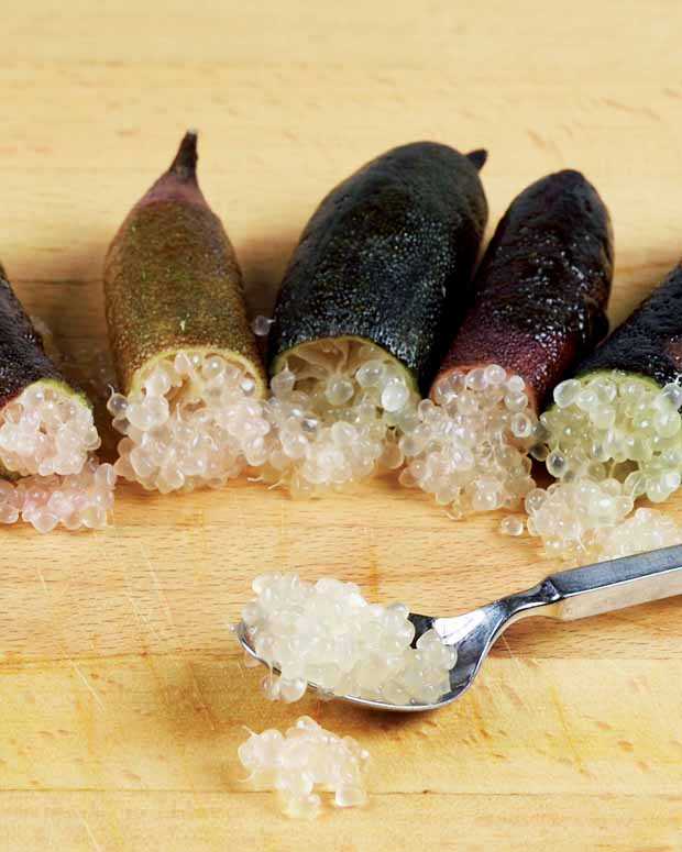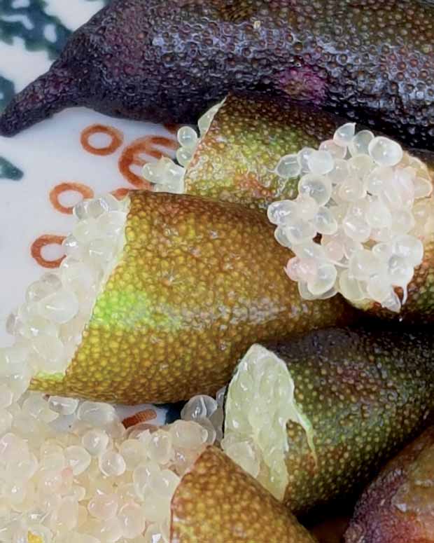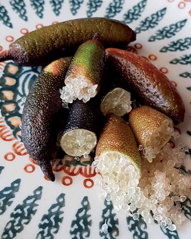 Cultivé pour ses fruits, davantage que pour son aspect décoratif, Microcitrus australasica donne le citron caviar" tant apprécié des grands chefs. Les fruits du "citron caviar" ont une forme allongée et ont la taille d'un doigt. Derrière sa peau verte, lisse et fine, le fruit renferme de multiples petites capsules s’apparentant à du caviar. Les petites billes contiennent un jus acidulé au goût unique, proche de celui du citron classique et du pamplemousse.
