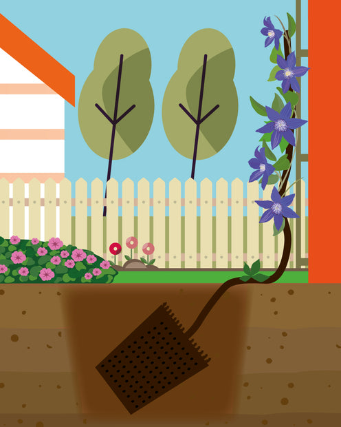 La clématite s’adapte à tous les types de sol, en particulier les sols non calcaires, neutres ou peu acides avec un bon drainage. Les arrosages doivent être réguliers mais peu abondants, surtout durant l’été. Lors des arrosages, évitez de mouiller le feuillage pour prévenir des maladies cryptogamiques. La plantation extérieure est possible toute l’année, de préférence en automne ou au printemps. La clématite se plait directement en plein soleil ou en situation mi-ombragée, elle est très résistante au froid et supporte des températures jusqu'à -20°C. Il faut la planter en créant un espace de 1,2 mètre entre chaque plant. Lors de la plantation, pensez à lui fournir un support (treillis, tuteur…) sur lequel ses tiges s’accrocheront. Une bonne couche de paillage est bénéfique pour garder le sol frais.