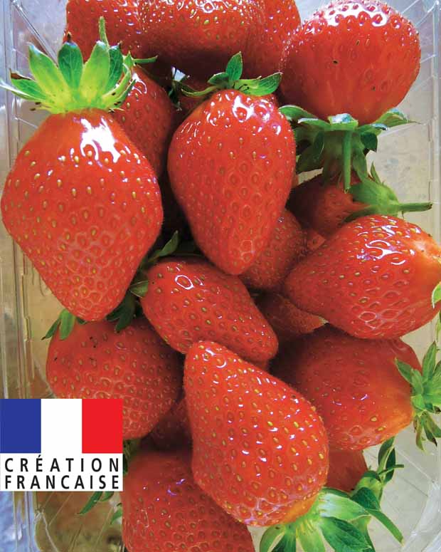 Nouvelle venue sur le marché des fraises haut de gamme". Remontante, c'est la 'Gariguette' de saison. Gros fruits allongés, à la saveur exceptionnelle, sucrés et parfumés. Grosse récolte et grande vigueur.
