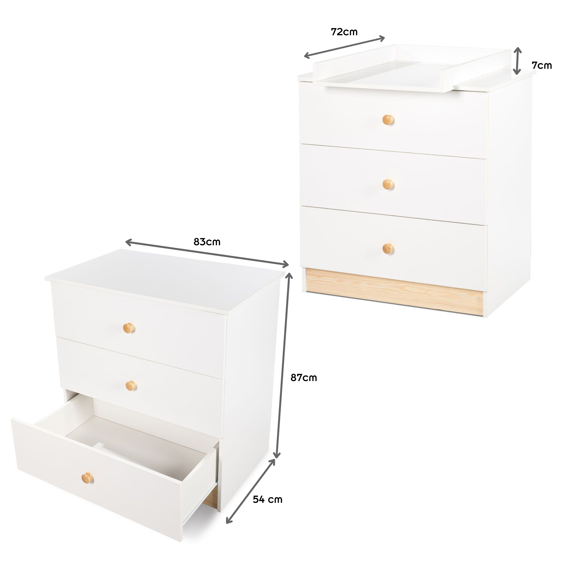 | Plus produit | Commode à langer avec 3 tiroirs. Le plan à langer amovible peut être retiré lorsque bébé grandit. |