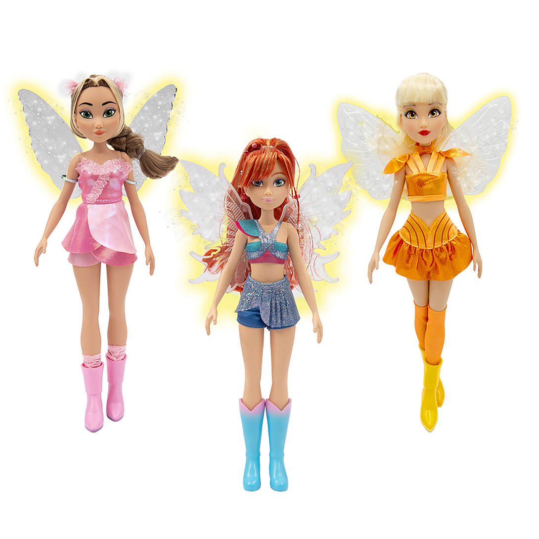 | Plus produit | Ailes détachables illuminées, tenue pailletée, accessoires de cheveux, présenté en boîte fenêtre aux graphismes Winx. |