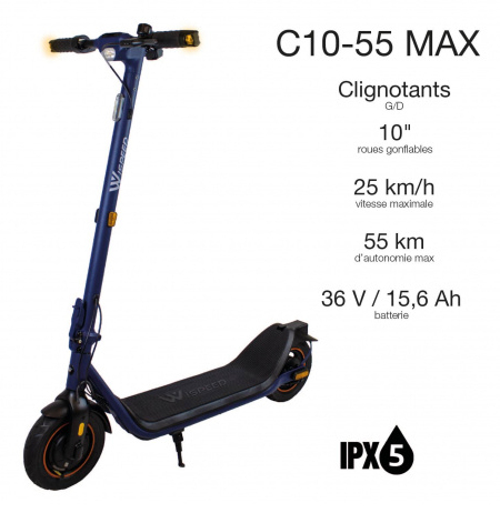 Wispeed C10-55 Max. Type: Scooter classique, Couleur du produit: Noir, Bleu, Vitesse de pointe: 25 km/h. Capacité de la batterie: 15,6 Ah, Puissance du moteur: 350 W, Puissance maximale du moteur: 650 W. Poids: 19,2 kg