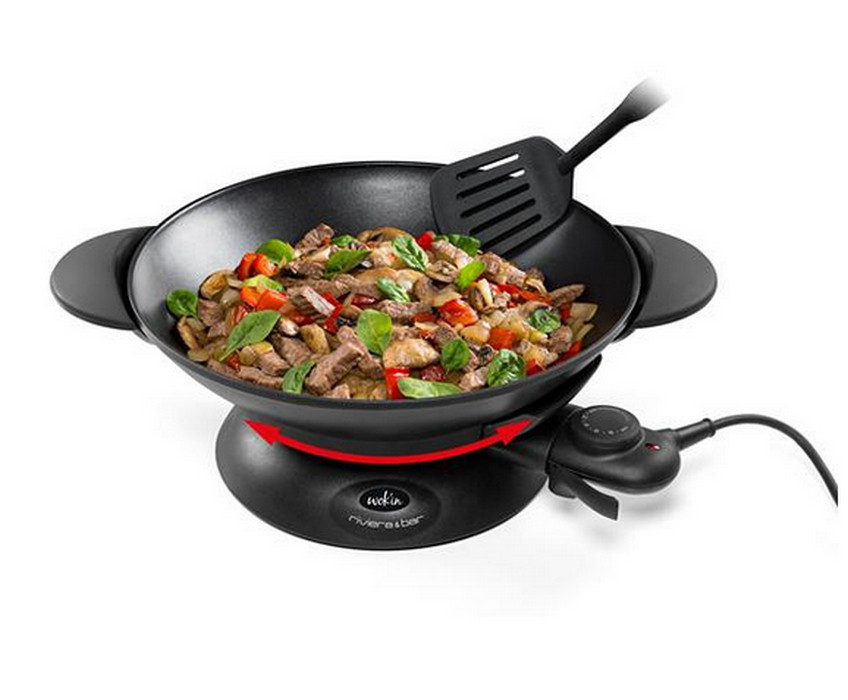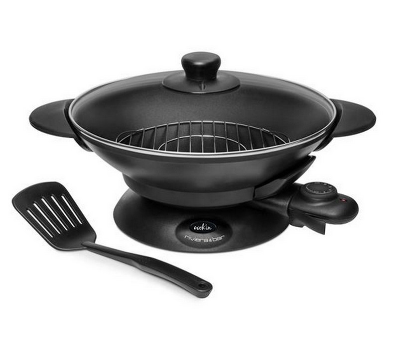 qwk450 - wok électrique 2200w - Wok électrique RIVIERE&BAR QWK450.- Découvrez de grande variété de plats régionaux et nationaux, spécialités exotiques et asiatiques pour les plaisirs d'une cuisine variée, saine et rapide!.- Thermostat réglable 10 positions pour s'adapter aux différents modes de cuisson (maintien au chaud, mijoter, rissoler, saisir, rôtir...).- Cuve massive en fonte d'aluminium anti-adhésive avec résistance intégrée et montante pour une diffusion optimale de la chaleur.- Livré avec une grille inox pour la cuisson à la vapeur, un couvercle en verre avec disque de réglage d'échappement vapeur, une spatule thermoplastique et un livre de 15 recettes.- Poignée du couvercle et anses de la cuve thermo-isolées.- Bloc d'alimentation muni d'un loquet pour faciliter l'extraction.- Entièrement démontable pour un entretien facilité. - Capacité de la cuve : 5l (jusqu?à 6 personnes).