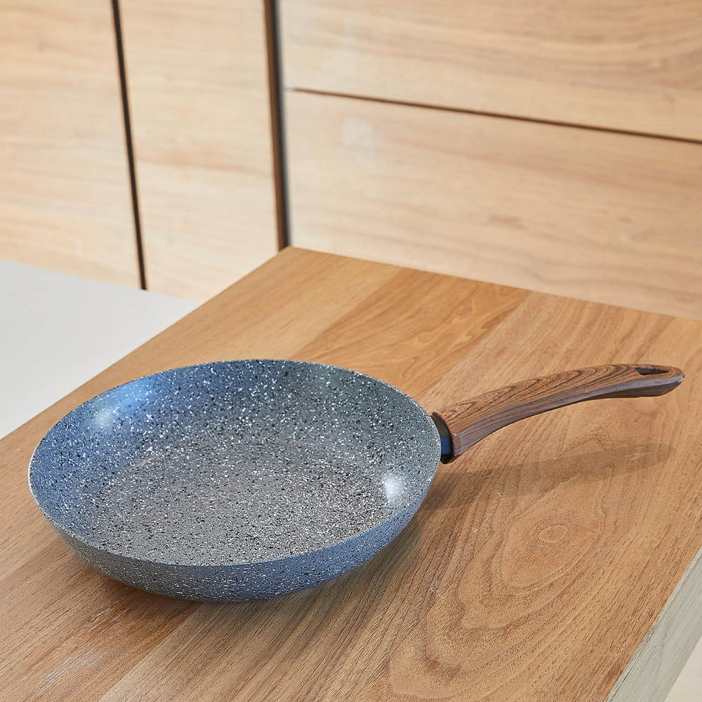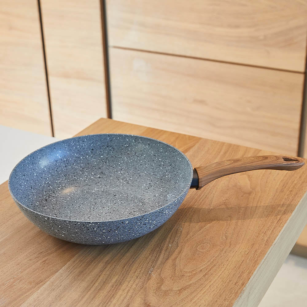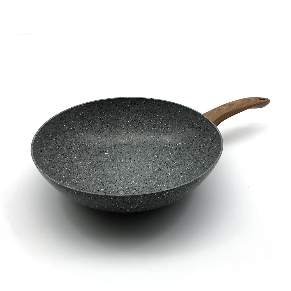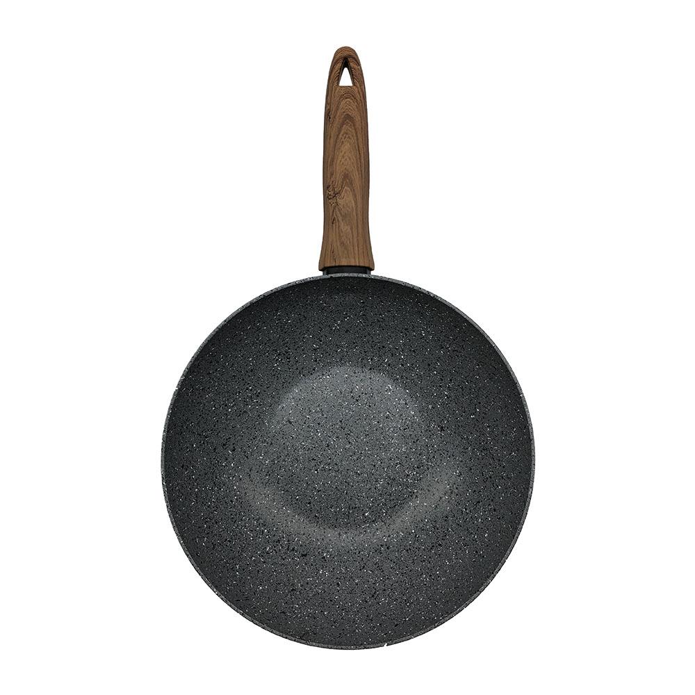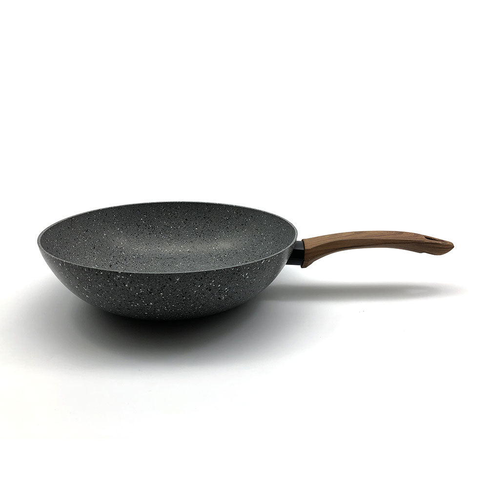 • Fabriqué en Europe. Wok en aluminium induction antiadhésif. diamètre 28 cm avec manche imitation bois. Paroi en aluminium épaisseur 3mm. Revêtement intérieur et extérieur antiadhésive. Finition intérieure: Satiné. Finition extérieur: Poli avec décoration. Finition du fond extérieur: Satiné.
