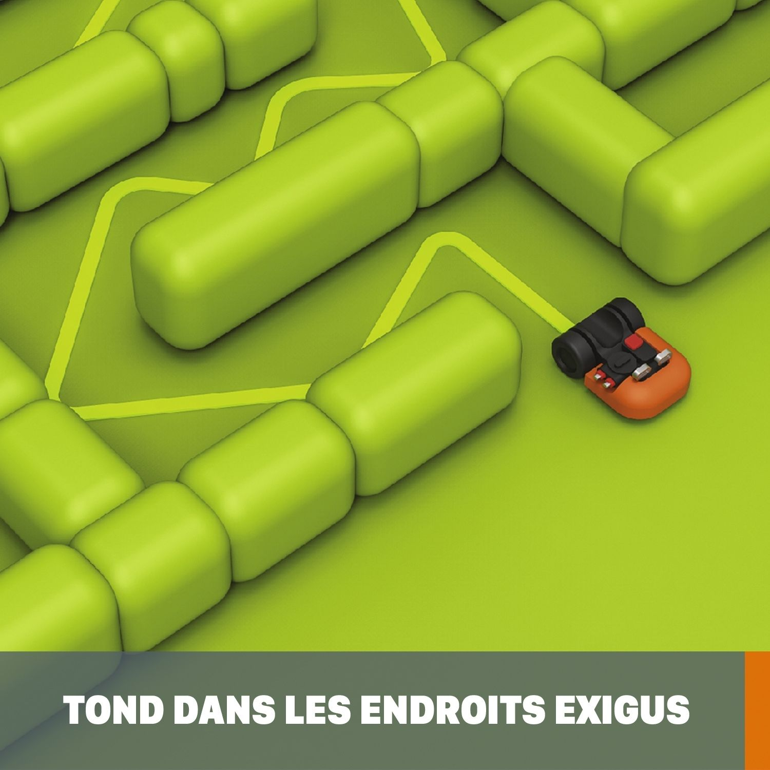 - Tondre sans difficultés dans les passages étroits : trouve toujours son chemin dans les passages étroits sans avoir besoin d’un câble de guidage.
