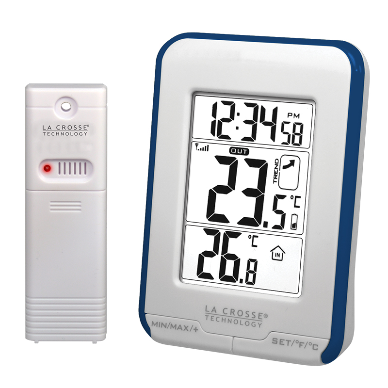 Heure - Réglage manuel de l’heure - Format : 12H ou 24H Température Intérieure - Unité : °C ou °F - De 0°C à 50°C (32°F à 122°F) - Résolution : 0.1°C/0.2°F - Enregistrement des Mini/Maxi Température Extérieure - Unité : °C ou °F - De -40°C à 60°C (-40°F à 140°F) - Résolution : 0.1°C/0.2°F - Enregistrement des Mini/Maxi - Indicateur de tendance Transmission - Indicateur de la force de transmission du capteur extérieur - Transmission sans fil jusqu’à 90 mètres (300 ft.) en champ libre - Fréquence : 433 MHz Généralités - Indicateurs de piles faibles - Se pose sur une surface plane Informations Logistiques Dimensions de la base : 76 x 40 x 106 mm Dimensions du capteur : 40 x 20 x 130 mm Alimentation de la base : 2 x AA LR6 1.5V (Piles non incluses) Alimentation du capteur : 2 x AA LR6 1.5V (Piles non incluses)