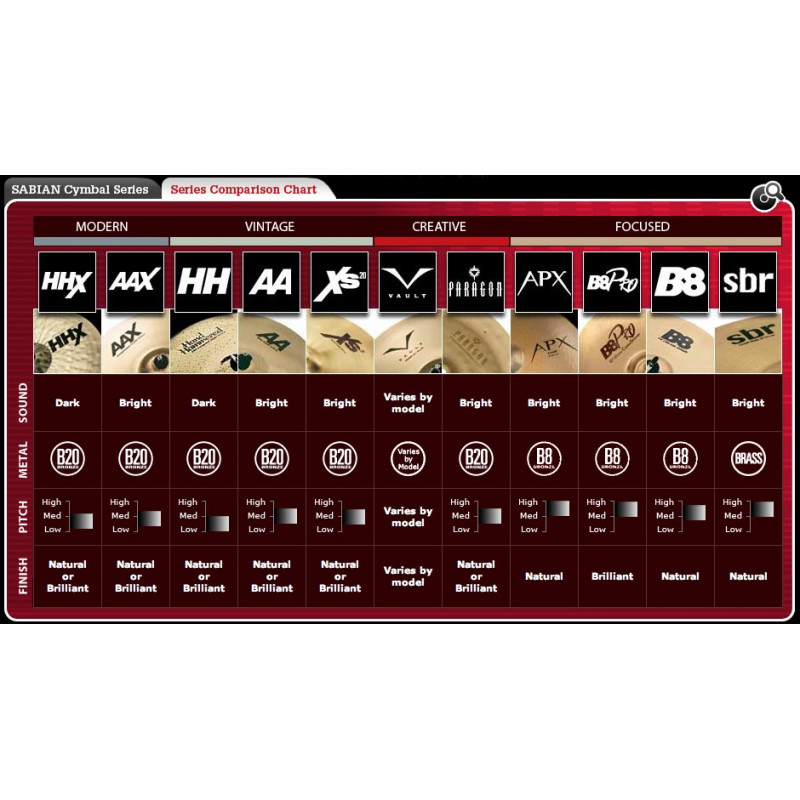 Déclinaison moderne des AA, les SABIAN AAX sont caractérisées par une puissance sonore accrue et un ping plus puissant! Donc, même si les AA emplissent l'espace sonore de manière uniforme, c'est-à-dire que l'on a l'impression qu'elles nous entourent, ici on a toujours l'impression que le son est partout, mais en plus il est fort ! Les crash révèlent à nous cette impression de la façon la plus nette puisque justement, on les crashe ! Ecoutez les, vous allez voir que de 14" à 18", elles sont très très présentes ! Ici, ce sont les plus "explosives" des crashs! Elles portent leur nom comme un gant! ”LA PRECISION” Grâce à leur concept exclusif ”Réponse Autofocus”, filtrant toutes les harmoniques indésirables et ré-égalisant les fréquences graves et aiguës de la cymbale pour un mélange tonal totalement brillant, la série AAX restitue les sonorités les plus pures, les plus contrôlées, quelque soit le volume de votre jeu.