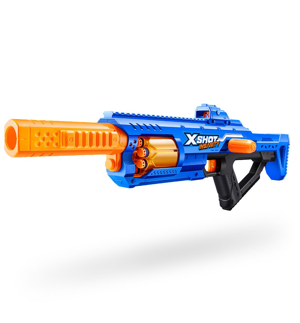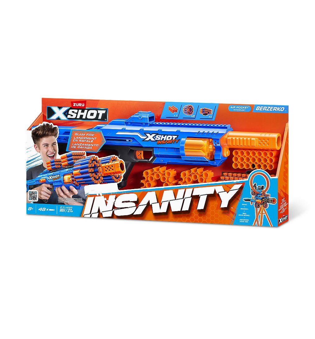 Ensemble insensé d'action et de munitions avec XSHOT Insanity! La Berzerko XSHOT Insanity est assez puissant pour atteindre des cibles à 27 m ! Ce pistolet va faire pâlir tes adversaires avec un tir rapide de 8 fléchettes en quelques secondes grâce à son canon rotatif, et à une quantité folle de stockage de 66 fléchettes supplémentaires pour être toujours prêt au combat ! Les fléchettes XSHOT intègrent la nouvelle Technologie à poche d'air pour tirer plus loin, plus rapidement et avec plus de précision. Combine le Berzerko avec d'autres pistolets d'Insanity pour fabriquer le plus fou des pistolets!Dimensions:68.1 x 13.5 x 20.4cm