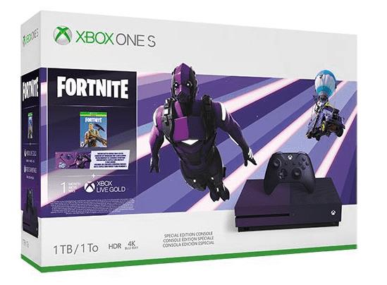 Découvrez la Xbox One S 1 To édition limitée Fortnite Battle Royale. Comprend une console One S (lecteur Blu-ray 4K Ultra HD, streaming en 4K et technologie High Dynamic Range), plus une manette Xbox ainsi que 1 mois d'essai au Xbox Live Gold et 1 mois d'essai au service XBOX Game Pass. Profitez en plus de Fornite Battle Royale ainsi que des contenus cosmétiques suivants: un skin légendaire, deux skins épiques et 2000 V-Bucks. Découvrez le phénomène mondial: Fortnite Battle Royale et faites une entrée remarquée avec de superbes contenus cosmétiques Contenu : (1) Console Xbox One S 1 To (1) Manette sans fil Xbox One S (1) mois Xbox Live Gold offert (1) mois Xbox Game Pass offert (1) Skin Légendaire, Skin épique de parapente, Skin épique de pioche et 2,000 v-bucks. (1) Câble HDMI (compatible 4K) (2) Piles LR6.