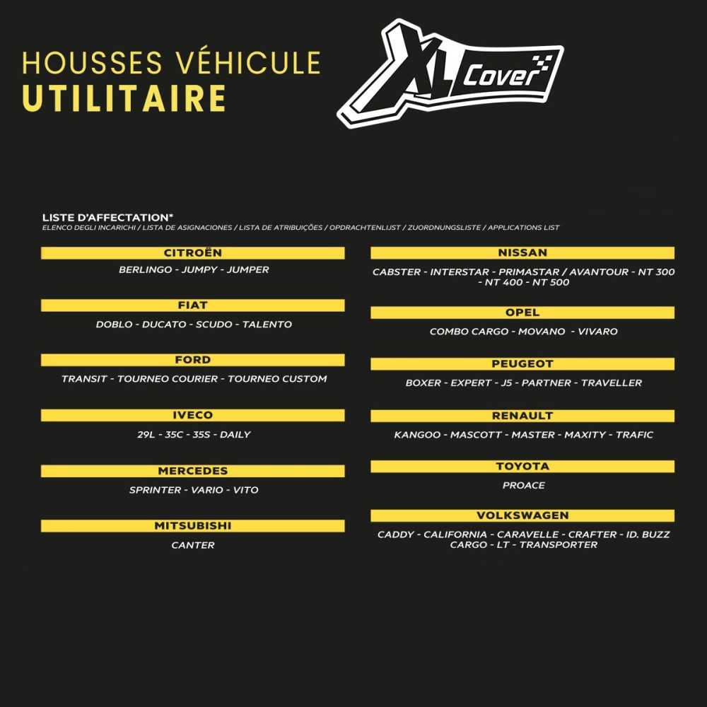 Plus produit Airbag compatible; Imperméable; Nettoyage facile par essuyage; Installation rapide par scratch; Ajustement universel pour utilitaires; Ouvertures pour appuie-têtes et accès au verrou de ceinture