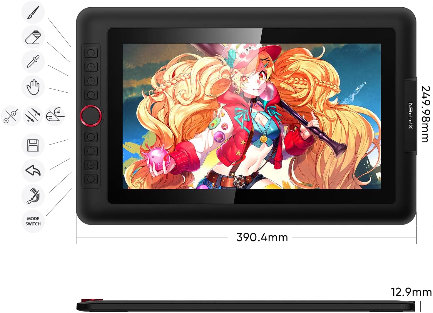 XP-PEN Artist 13 Pro dispose d’un écran d’affichage de 13.3 pouces, dimensions 390,4mm x 249,98mm x 12,9mm, épaisseur: 14mm, résolution: 1920x1080 pixels, angle de vue: 178°. Ecran graphique pour vous accompagner partout dans votre trajet créatif.