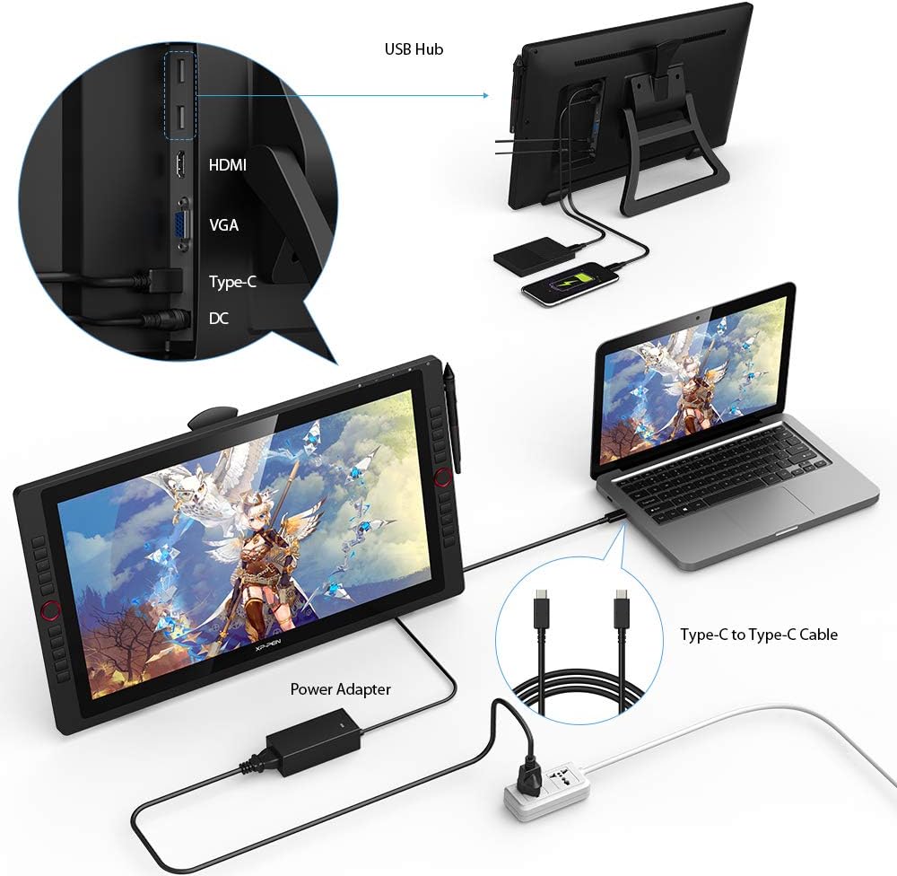 【Redéfinir la norme professionnelle】L'Artist 22R Pro est le premier support graphique qui prend en charge une connexion de Type-C à Type-C, vous permettant de connecter directement votre iMac/Mac Book Pro et d'autres ordinateurs Windows qui prennent en charge l'entrée Type-C au 22R Pro sans utiliser un Adaptateur de Type-C vers HDMI ou USB. L'Artist 22R Pro est équipée aussi du hub USB qui peut être utilisé pour connecter votre souris ou d'autres appareils.