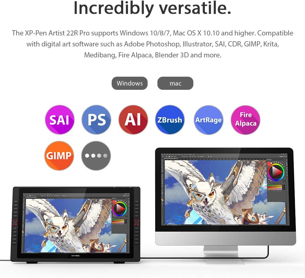 【Incroyablement polyvalent】La XP-Pen Artist 22R Pro prend en charge Windows® 10/8/7, Mac OS X® 10,10 et plus. Compatible avec les logiciels d'art numérique populaires tels que Adobe® Photoshop®, Illustrator®, SAI®, CDR®, GIMP®, Krita®, Medibang®, Fire Alpaca®, Blender® 3D et plus encore.