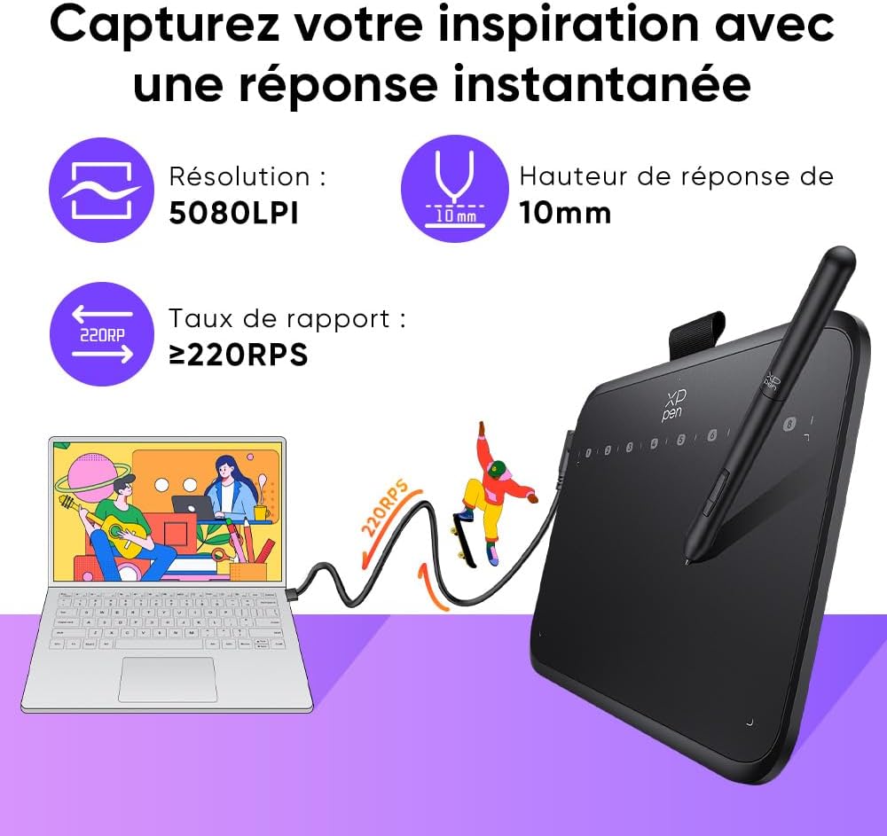 【Compact et Efficace】Zone de travail à 6 x 4 pouces avec 8 raccourcis virtuels, une résolution de stylet de 5080LPI et un taux de rapport de 220RPS, le curseur ne tarde pas à suivre la plume et tous vos dessins sont transférés à l'ordinateur de manière rapide et stable. Vous pouvez facilement maîtriser les compétences de dessin sur une tablette avec efficacité et confort.