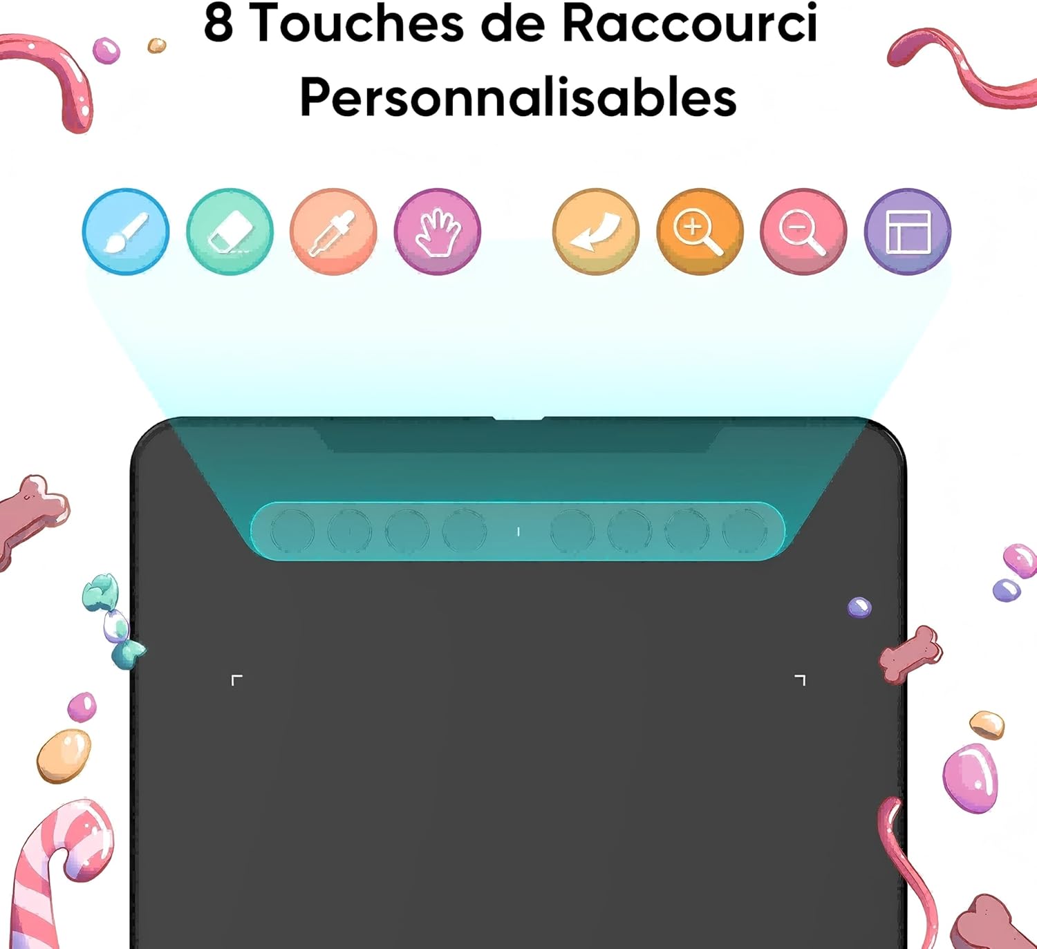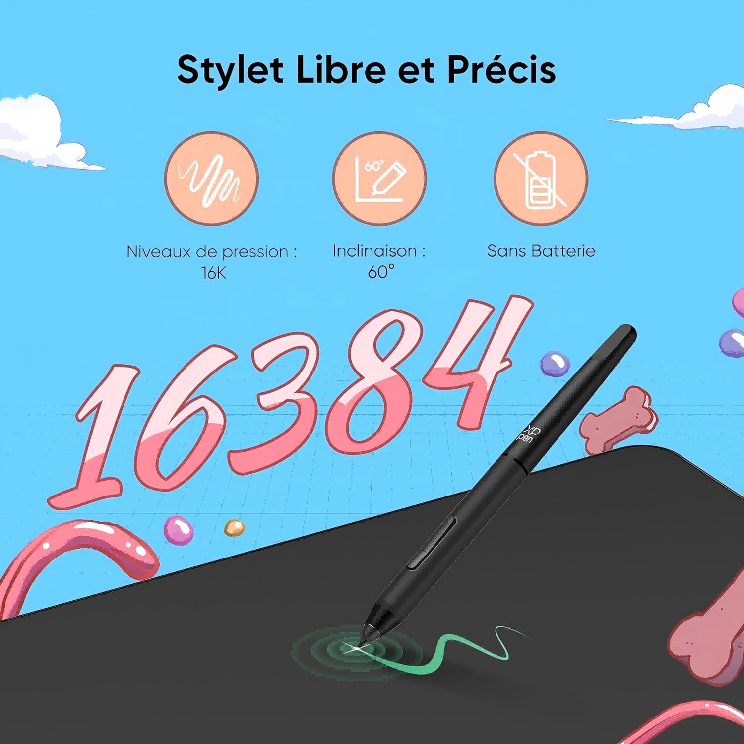 Stylet sans pile et 8 touches de raccourci : Avec 16 384 niveaux de sensibilité à la pression, le stylet offre un contrôle exceptionnel. Les 8 touches de raccourci sont facilement accessibles et vous permettent de travailler de manière efficace.