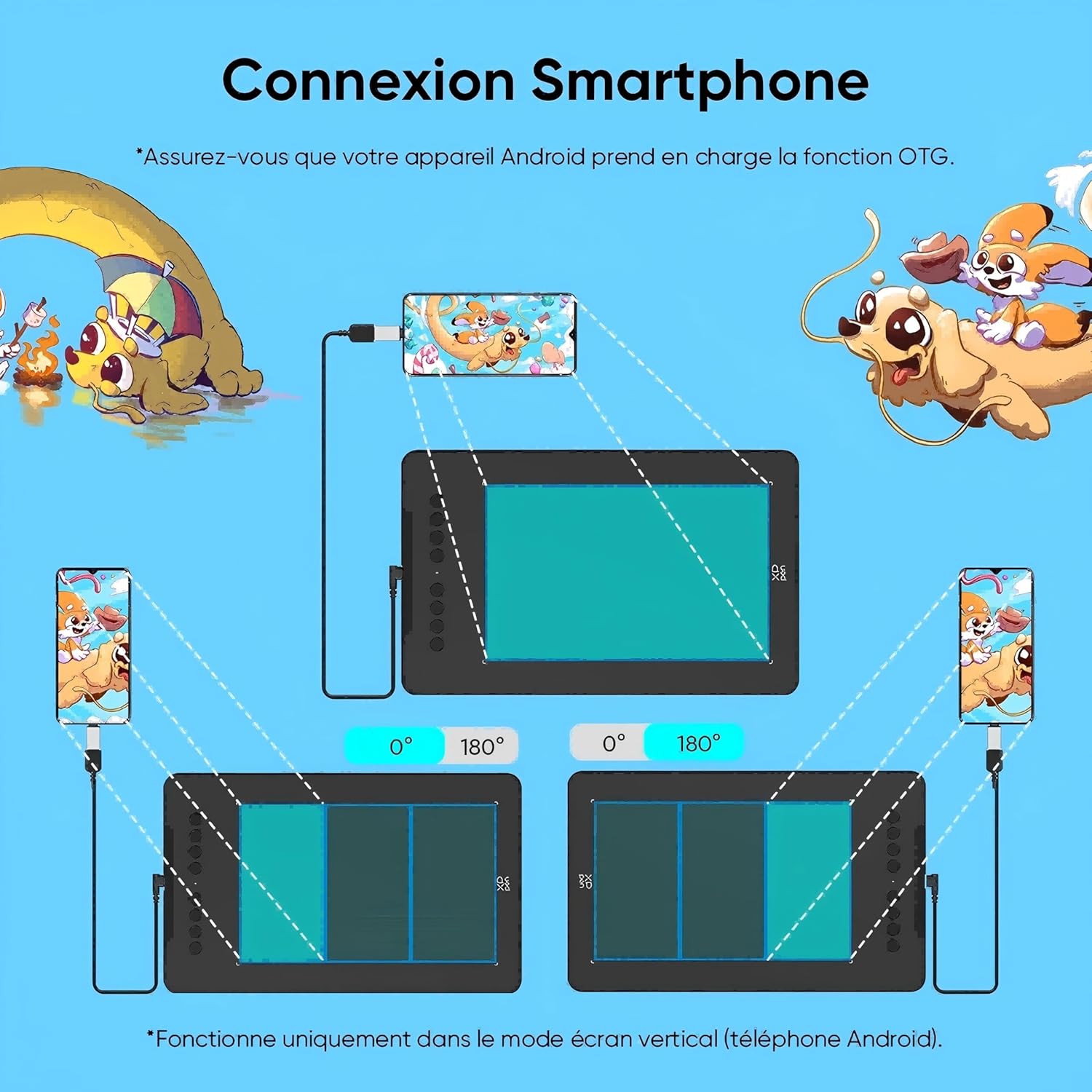 Prise en charge d'Android : Cette tablette est compatible avec les téléphones et tablettes Android 10.0 et versions ultérieures. Elle fonctionne avec des applications de dessin populaires telles que ibis Paint X, FlipaClip, Medibang, Autodesk Sketchbook, Zenbrush et Artrage.