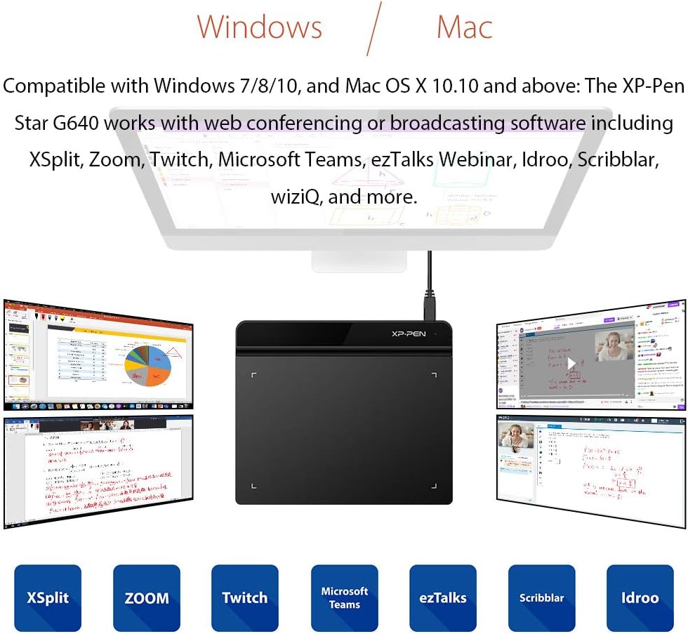Compatible avec la plupart des systèmes informatiques et logiciels tels que Microsoft Windows 10/8/7 et Mac OS x 10.10 ou version ultérieure. Compatible avec toutes les applications graphiques courantes telles que Photoshop, Painter, Illustrator, Clip Studio, etc. Aussi compatible avec OneNote, Jamboard, zoom whiteboard, Microsoft Whiteboard, Openboard ect pour réaliser les écritures / signatures électronique ou cours en ligne.