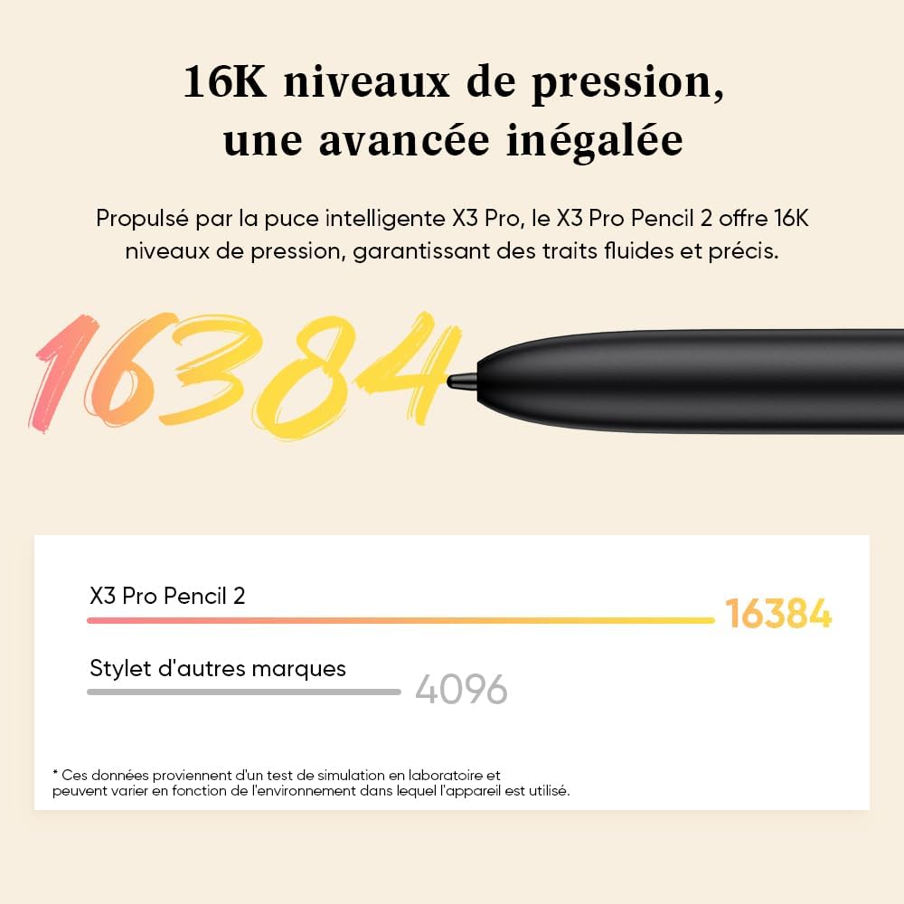Pencil Amélioré pour la Prise de Notes : Alimenté par la puce intelligente X3 Pro, le X3 Pro Pencil 2 dispose d'une sensibilité de 16K et d'une pointe de stylet douce, garantissant que chaque trait est fluide et délicat. L'aspiration magnétique et la touche de raccourci personnalisée améliorent votre productivité et votre confort.