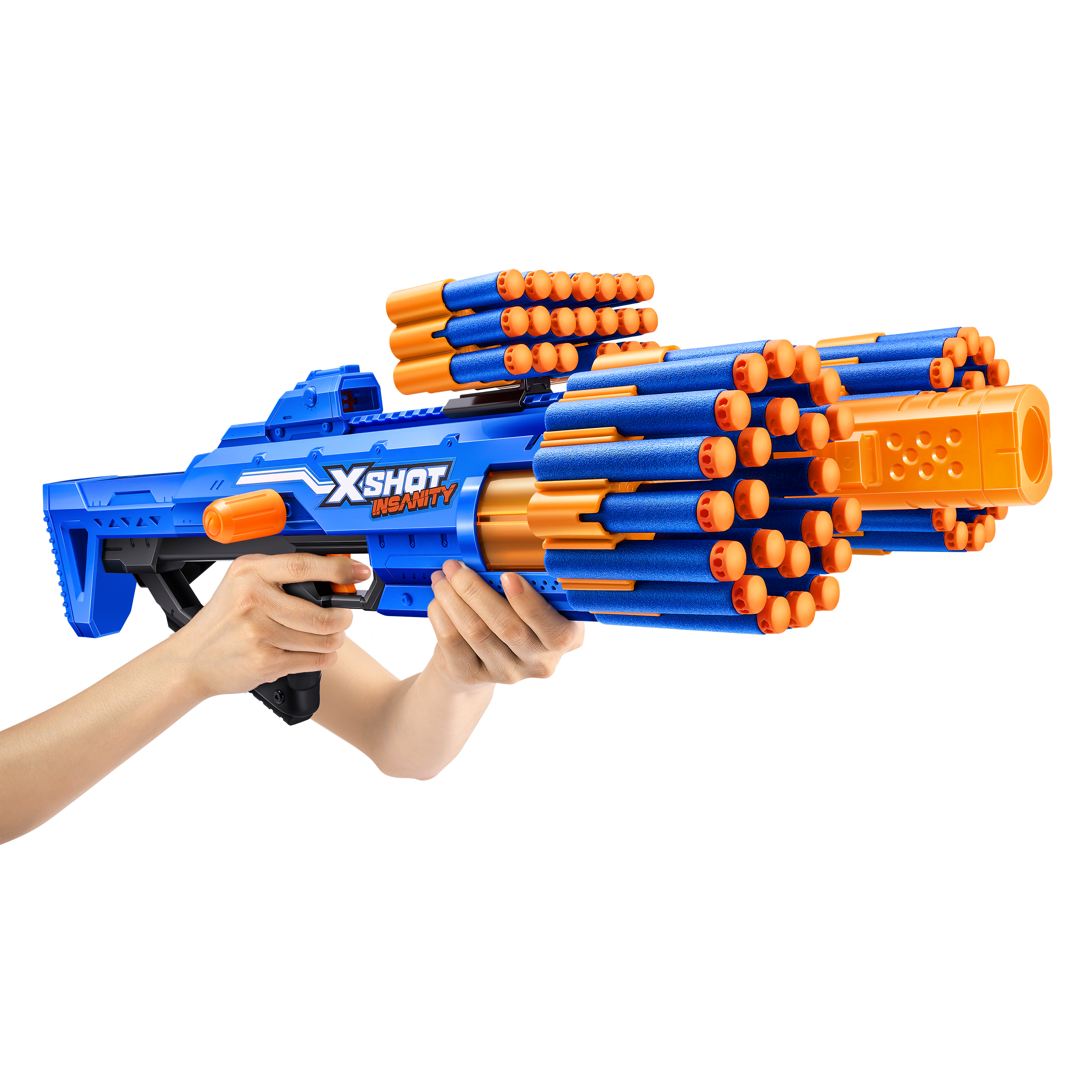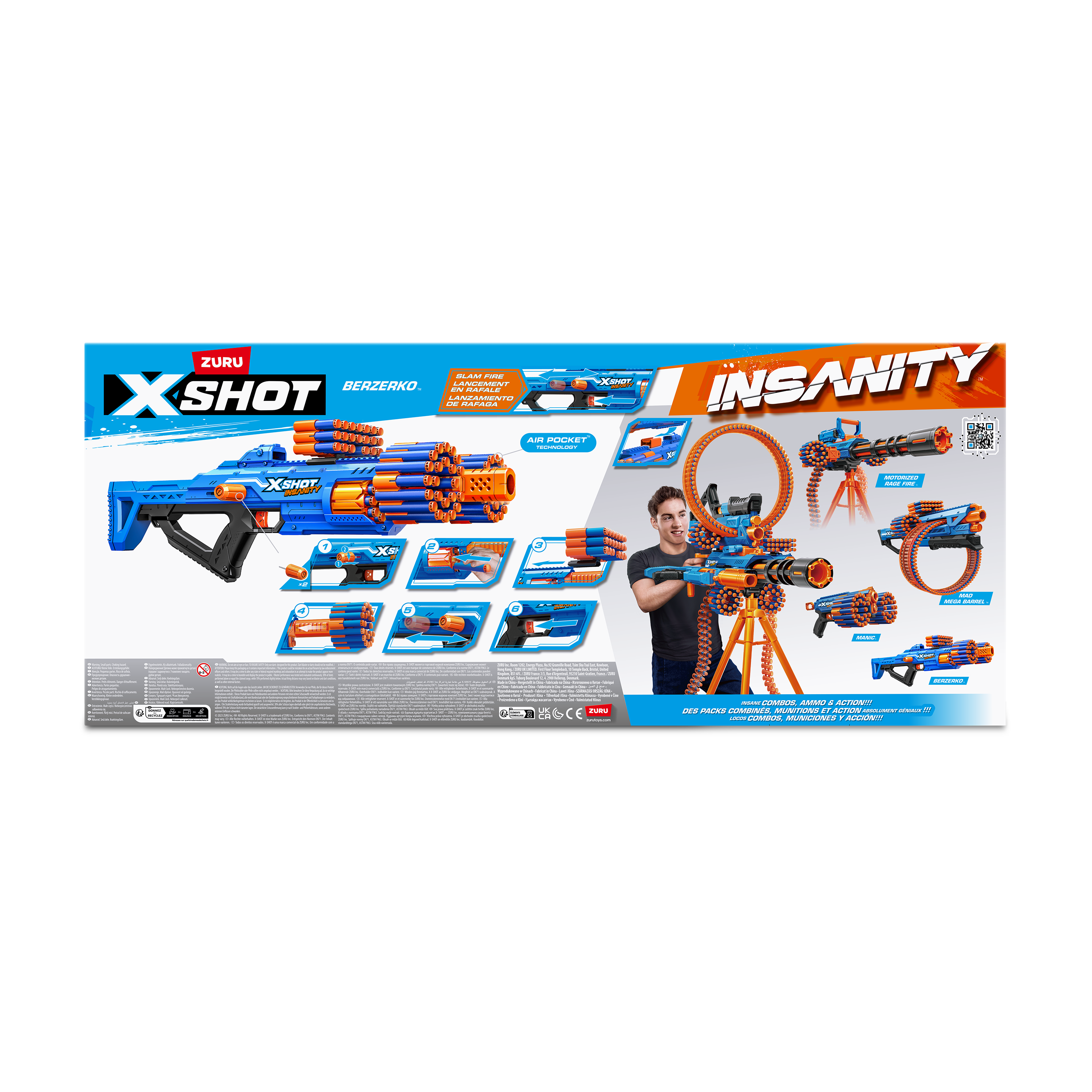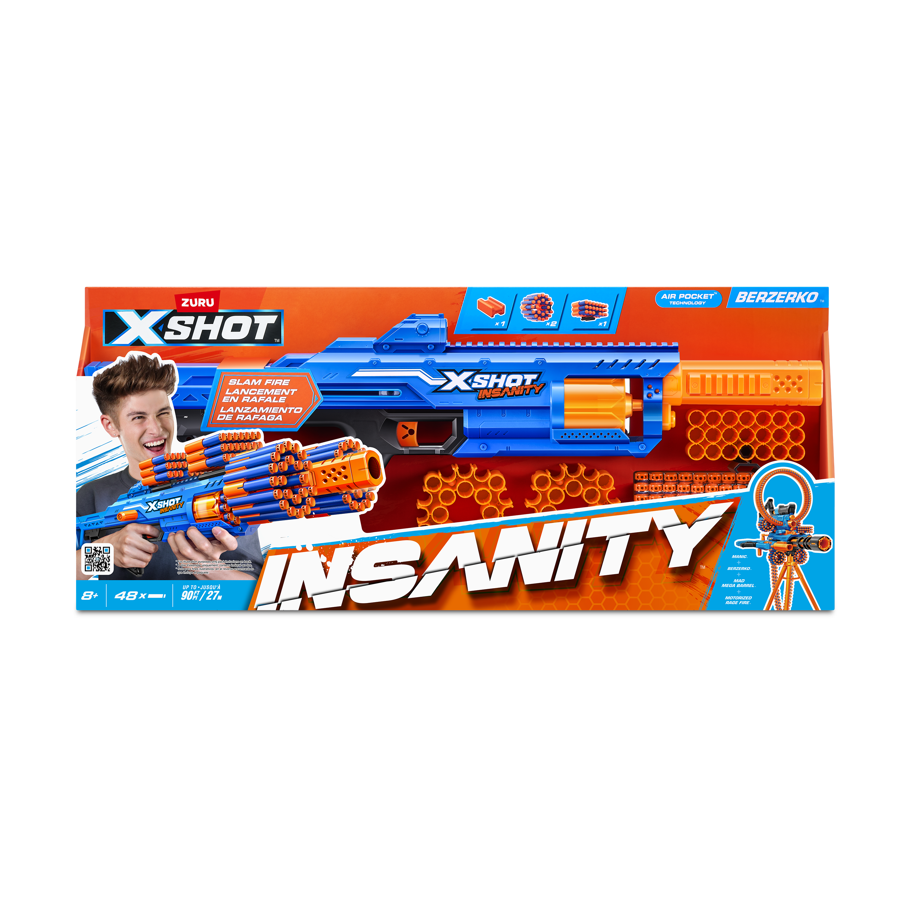Ensemble insensé d'action et de munitions avec XSHOT Insanity! La Berzerko XSHOT Insanity est assez puissant pour atteindre des cibles à 27 m ! Ce blaster élimine la concurrence avec un tir rapide de 8 fléchettes en quelques secondes en utilisant le canon rotatif, plus une quantité folle de stockage de fléchettes pour tenir 66 fléchettes supplémentaires pour rester chargé au combat. Le mécanisme d'enclenchement à verrou permet de frapper la concurrence avant qu'ils ne te voient venir. Les fléchettes XSHOT intègrent la nouvelle Technologie à poche d'air pour tirer plus loin, plus rapidement et avec plus de précision. Combine le Berzerko avec les autres blasters Insanity pour créer un méga blaster de folie !