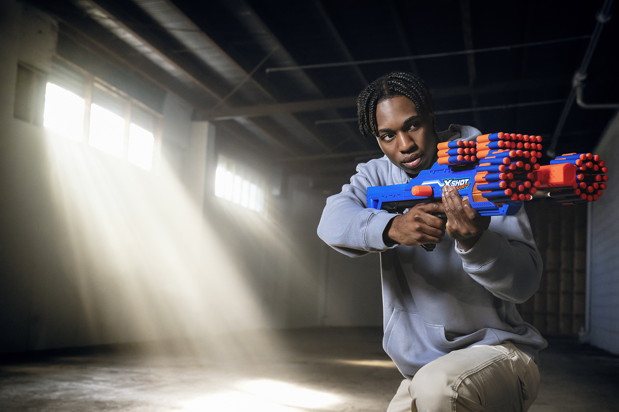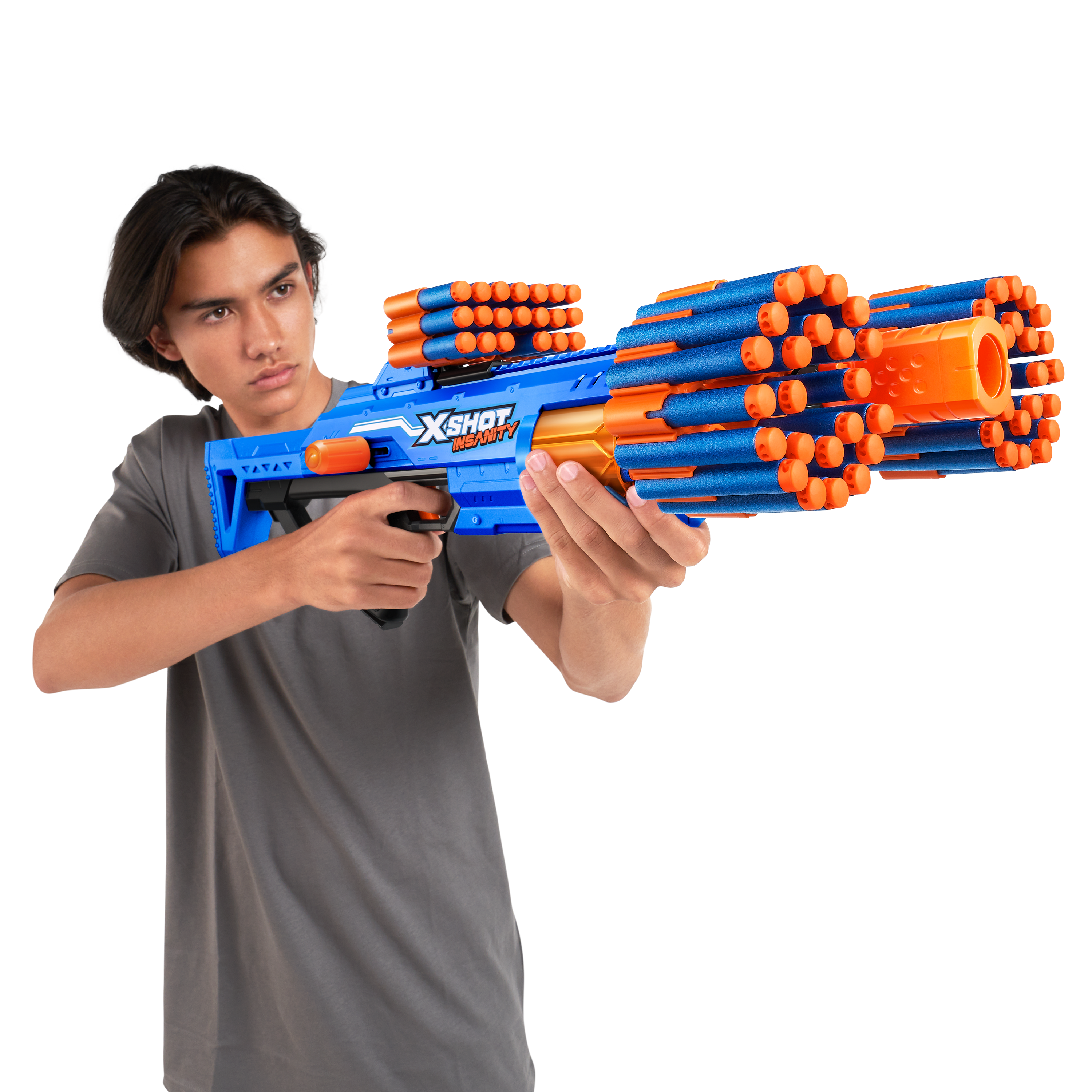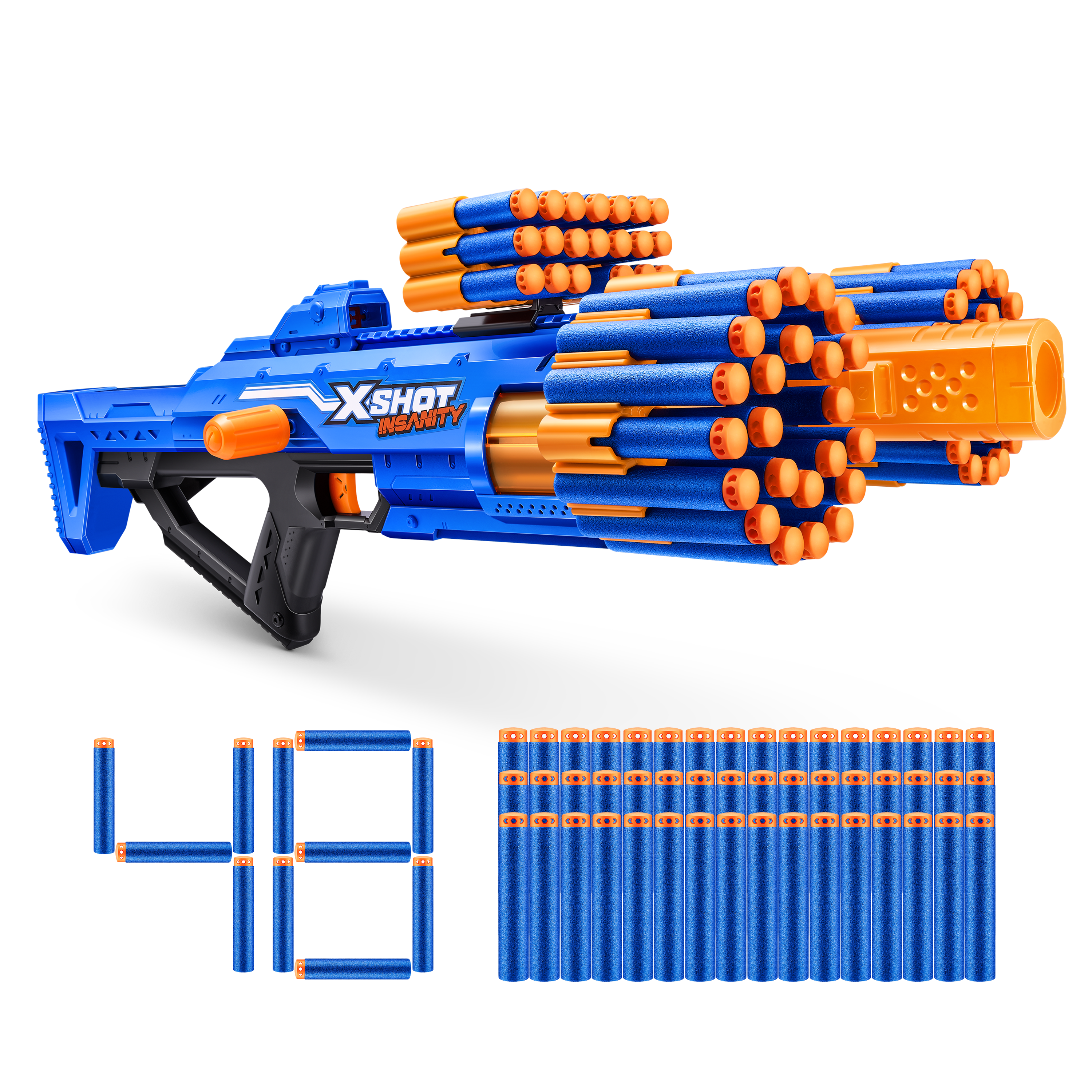 Ensemble insensé d'action et de munitions avec XSHOT Insanity! La Berzerko XSHOT Insanity est assez puissant pour atteindre des cibles à 27 m ! Ce blaster élimine la concurrence avec un tir rapide de 8 fléchettes en quelques secondes en utilisant le canon rotatif, plus une quantité folle de stockage de fléchettes pour tenir 66 fléchettes supplémentaires pour rester chargé au combat. Le mécanisme d'enclenchement à verrou permet de frapper la concurrence avant qu'ils ne te voient venir. Les fléchettes XSHOT intègrent la nouvelle Technologie à poche d'air pour tirer plus loin, plus rapidement et avec plus de précision. Combine le Berzerko avec les autres blasters Insanity pour créer un méga blaster de folie !