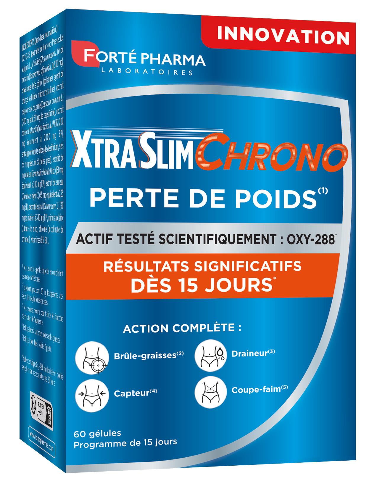 Le département Recherche & Développement des Laboratoires Forté Pharma a mis au point XtraSlim CHRONO, une formule complète et innovante, dotée d’un actif testé scientifiquement* démontrant des résultats rapides, complété par 9 autres actifs : • L’OXY-288 est un complexe exclusif d’origine naturelle composé d'extraits de feuilles d'oliviers millénaires, de romarin et de haricot blanc, riche en polyphénols. Ce complexe a fait l’objet d’une étude scientifique* qui a prouvé l’efficacité de son mécanisme d’action puisqu’elle a démontré des résultats significatifs dès 15 jours* versus placebo. • Le sureau qui contribue à la perte de poids et favorise l’élimination. • Le piment doux, grâce à sa teneur en capsaïcine, qui aide à brûler les graisses. • Le nopal qui aide à capter les sucres et les graisses et contribue à réduire l’appétit. • La formule d'XtraSlim CHRONO est complétée par du carvi, du myrobalan, des vitamines B5 et B6, ainsi que du duo zinc et chrome(6).