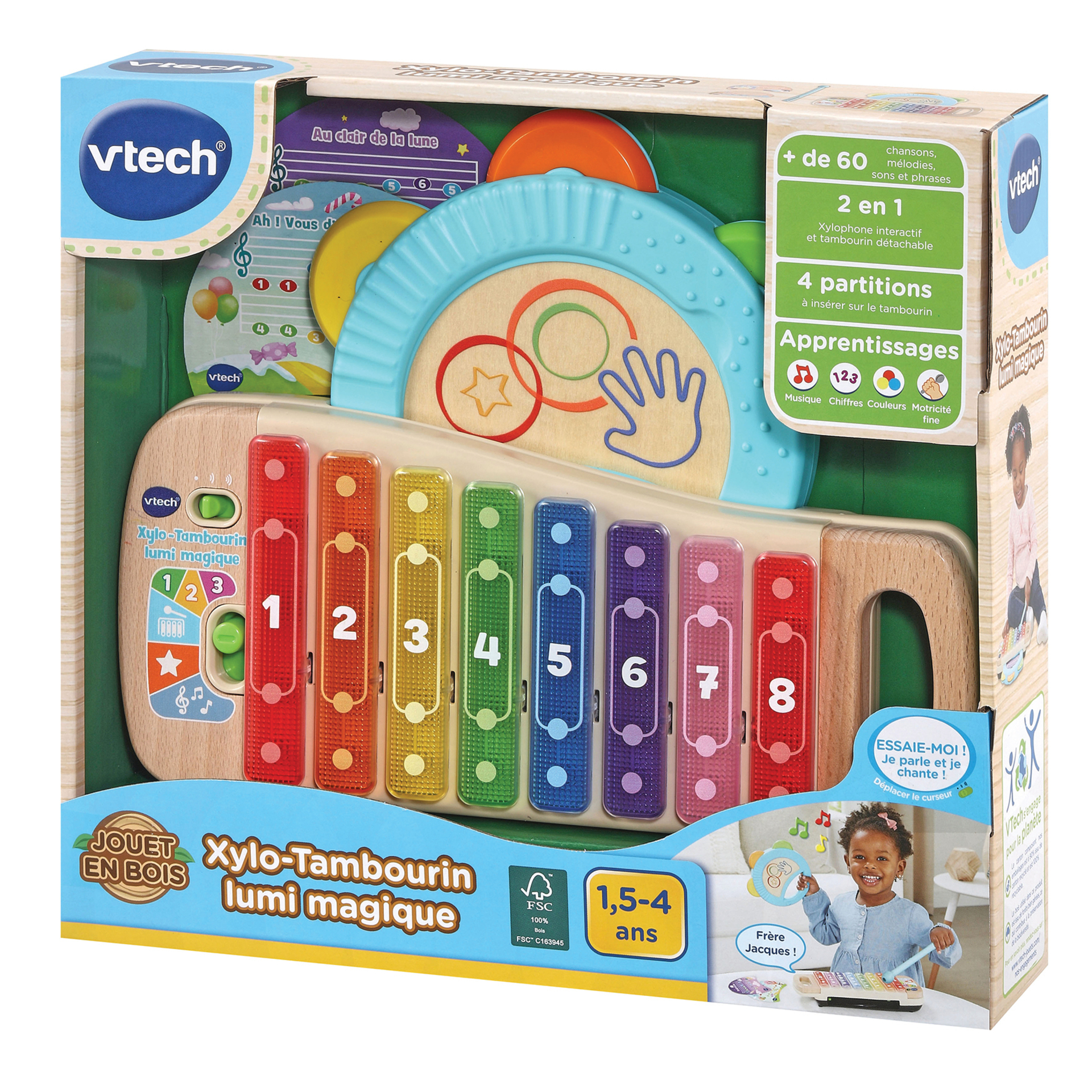 Xylo-tambourin lumi magique (jouet avec partie bois certifié FSC®) - 1.5- 4 ans Un super instrument 2 en 1 pour stimuler la créativité de l’enfant ! • A la fois xylophone et tambourin, électronique et lumineux, cet instrument en plastique et en bois certifié FSC® stimule la créativité et l’oreille musicale de l’enfant. • Grâce aux 8 touches lumineuses du xylophone, l’enfant découvre les couleurs, les chiffres, les notes de musique et développe sa motricité fine. • 2 partitions recto-verso apprennent à l’enfant à jouer des comptines entraînantes. Elles se placent sur le tambourin pour créer un pupitre. • Un jeu de répétition permet à l’enfant de reproduire ses morceaux préférés. • Le tambourin est amovible et peut être utilisé séparément • 8 touches lumineuses et 4 modes de jeu : apprentissage, instruments, jeu libre et répétition. • Arrêt automatique et réglage du volume sonore. Boîte try-me. Fonctionne avec 2 piles LR6 fournies.