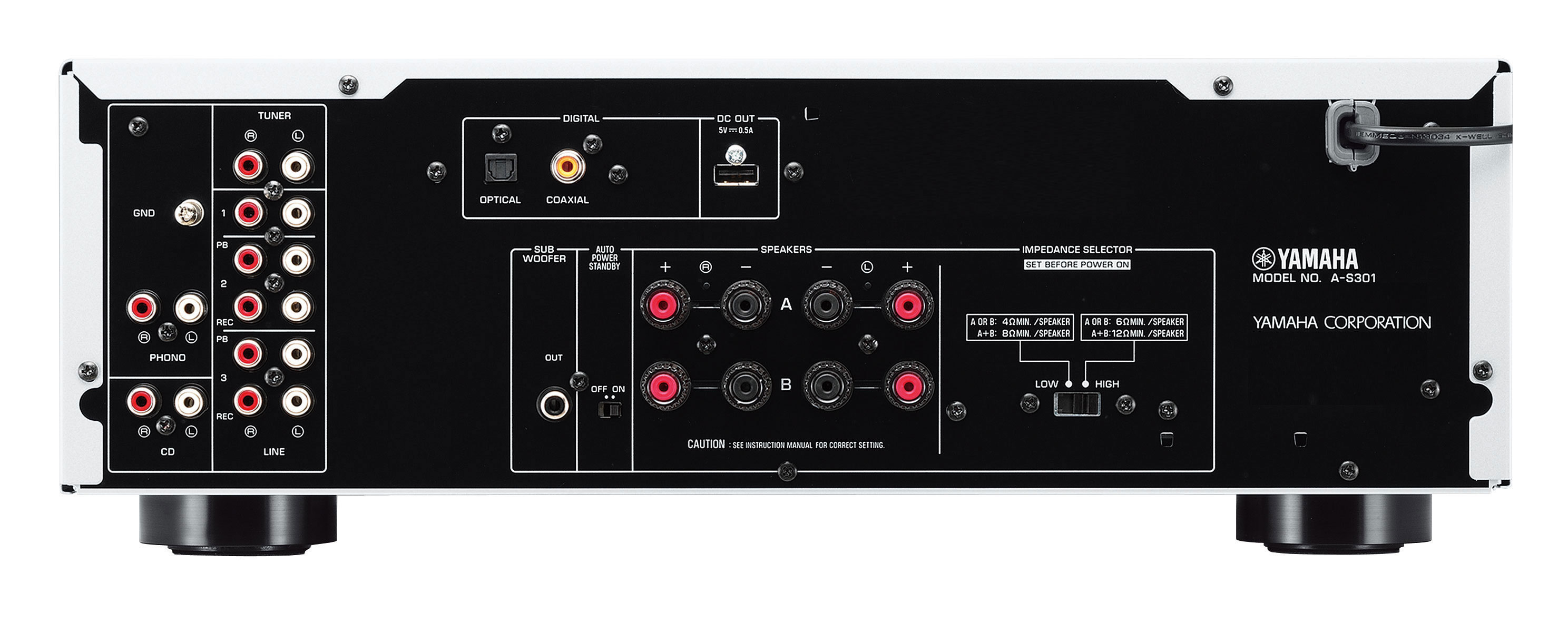 Yamaha A-S301. Canaux de sortie audio: 2.0 canaux, Massima potenza per canale: 95 W, DHT, distorsion harmonique totale: 0,019%. Consommation d'énergie (mode veille): 0,5 W. Largeur: 435 mm, Profondeur: 387 mm, Hauteur: 151 mm