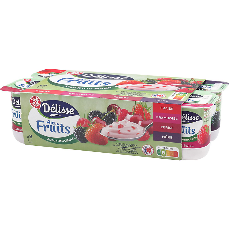 Ingrédients : Lait entier pasteurisé 70,3 % (teneur moyenne), fruits (fraise 10,8 % ou cerise 10,8 % ou mûre 10,8 % ou framboise 9,4 %), sucre 9,3 % (teneur moyenne), lait écrémé concentré ou en poudre, amidon de maïs, arômes naturels, jus concentré de citron, concentré de carotte noire, jus de carotte concentré, jus concentré de carotte noire, concentré de raisin, épaississant : pectines, ferments lactiques.