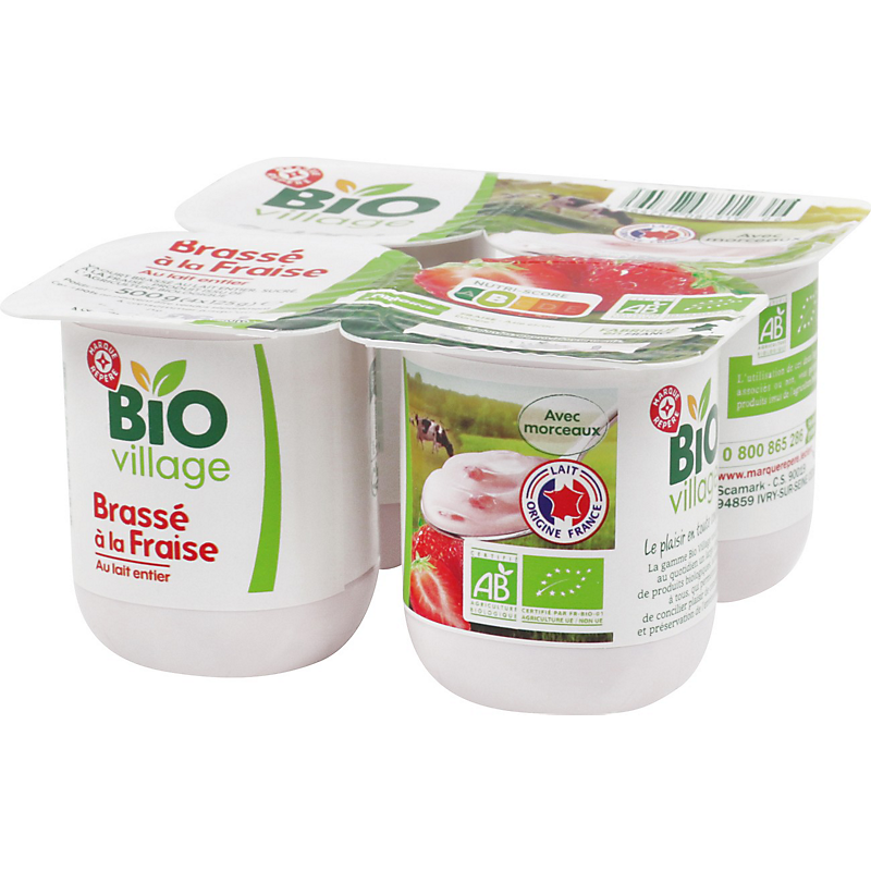 Yaourt brassé au lait entier, sucré, à la fraise - Produit issu de l'Agriculture Biologique BIO VILLAGE