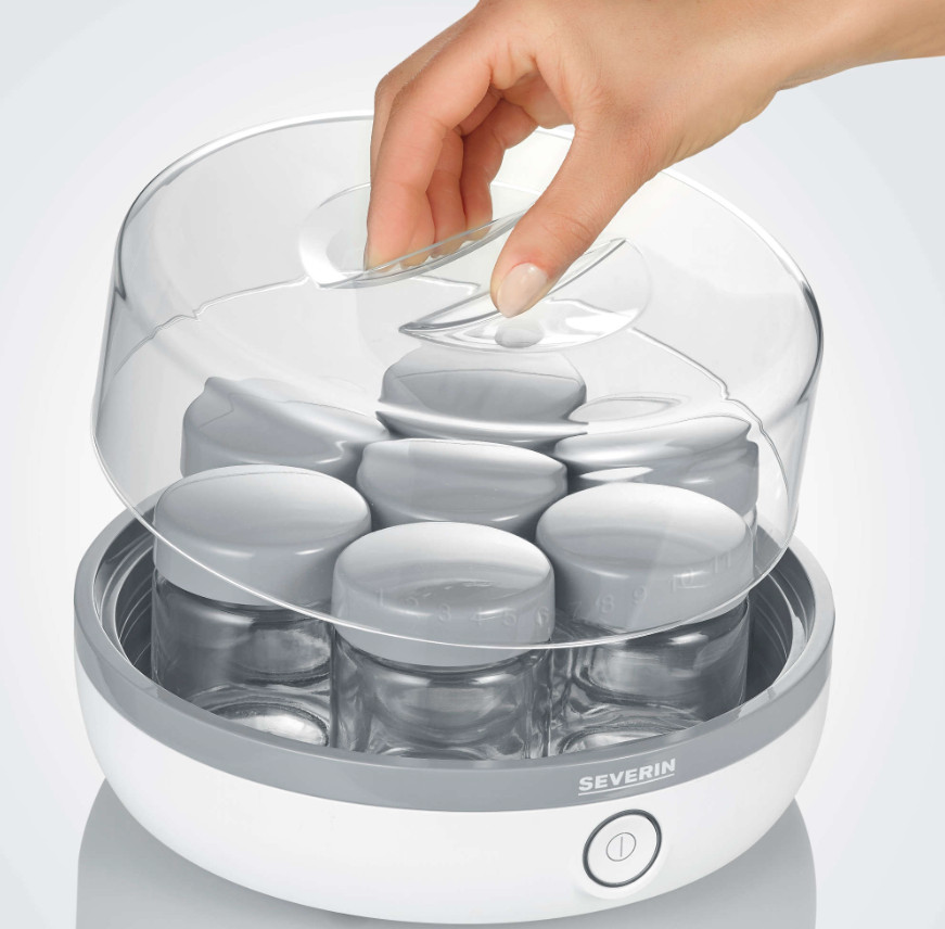 Yaourtière 7 pots - Réalisez facilement de délicieuses préparations maison grâce à cette yaourtière compacte ! - Graduation Mémo : comme aide-mémoire, l'horaire de début ou de fin de préparation peut-être marqué sur la graduation Mémo en tournant simplement le couvercle de l'appareil vers l'horaire correspondant - Livré avec 7 pots en verre de 150 ml chacun avec couvercle à visser - Couvercle transparent avec poignée - Graduation mémo pratique - Pieds caoutchouc antidérapants - Bouton marche-arrêt avec voyant lumineux - Coloris Blanc & Gris - Puissance 13 W - Garantie 2 ans.