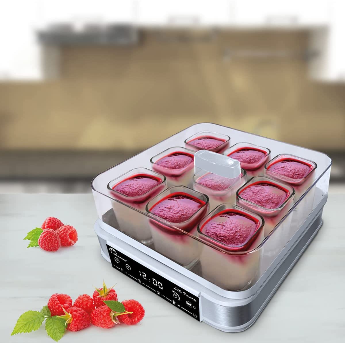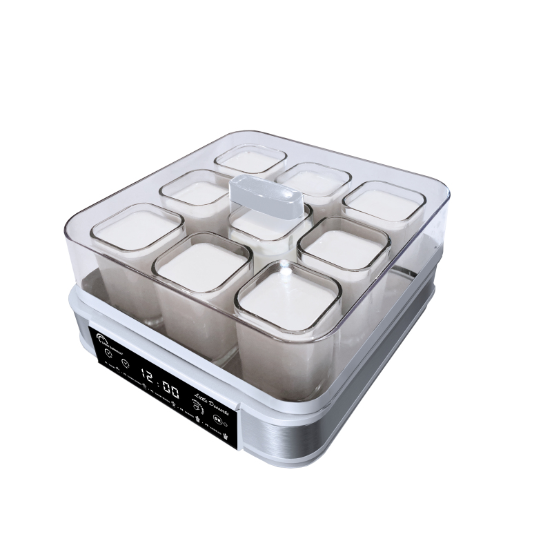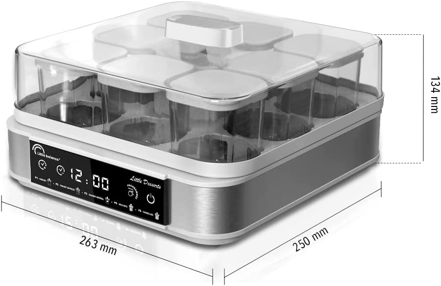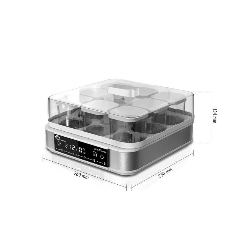 Yaourtière Dessertière 9 verrines, pour réaliser vous-mêmes très facilement yaourts, fromages blancs, et de nombreux desserts lactés. 9 pots en verres de 145 ml avec couvercle à clipser, compatibles lave-vaisselle Forme carrée, élégante et raffinée pour présenter directement vos préparations en verrine Plateau amovible ergonomique pour manipuler très facilement et en toute sécurité les 9 pots en même temps