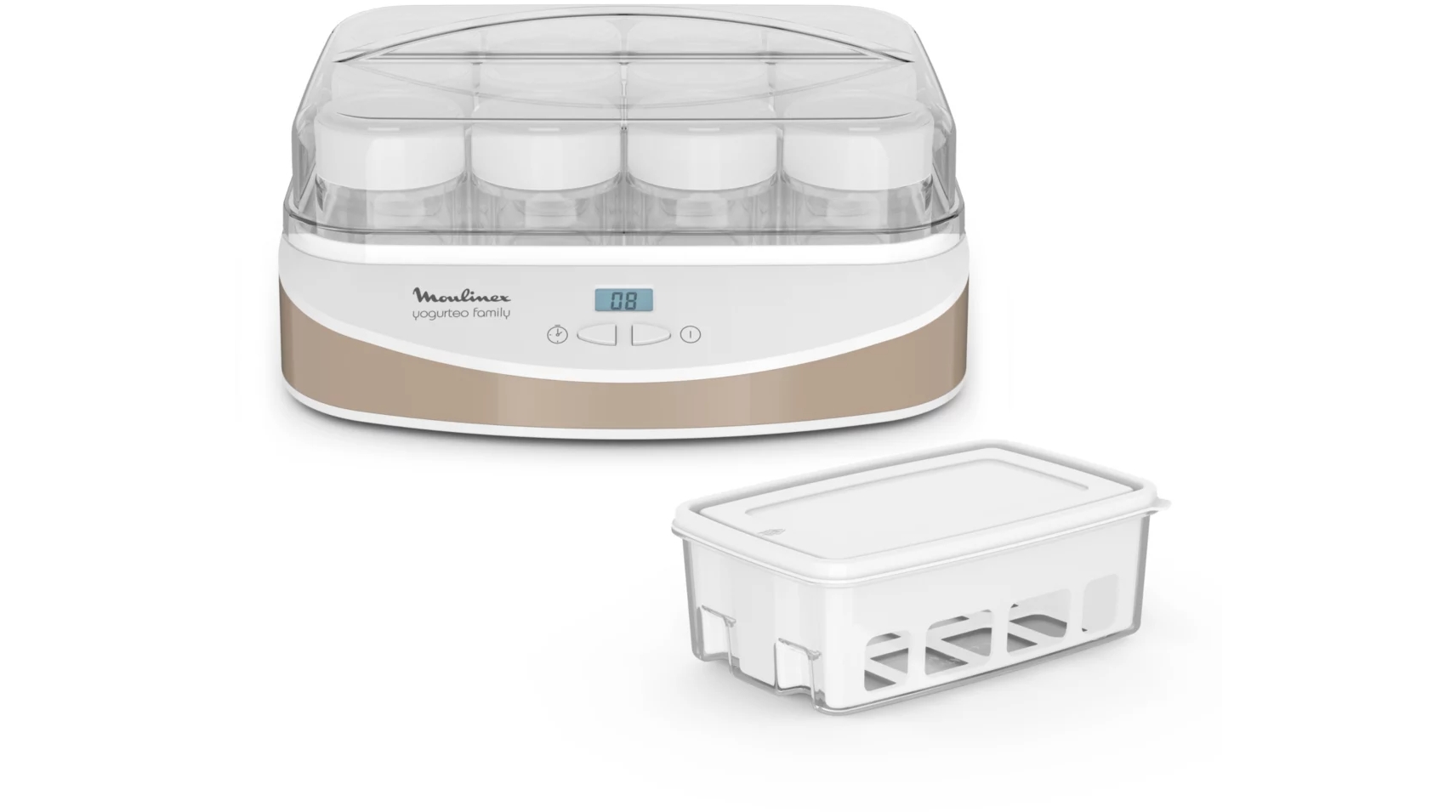 yg233a10 - yaourtière 12 pots de 200ml 21w - Yaourtière Yogurteo Family Moulinex YG233A10 dotée de 12 pots en verre de 200 ml pour faire vos yaourts maison et régaler toute la famille. Simple d?utilisation pour une préparation de yaourts simple et sans effort. Fonctions intelligentes : timer numérique simple d?utilisation programmable jusqu'à 15 heures avec arrêt automatique et signalsonore. Les pots sont équipés de couvercles dateurs. Pratique, les pots ainsi que les couvercles se rangent facilement dans la yaourtière.