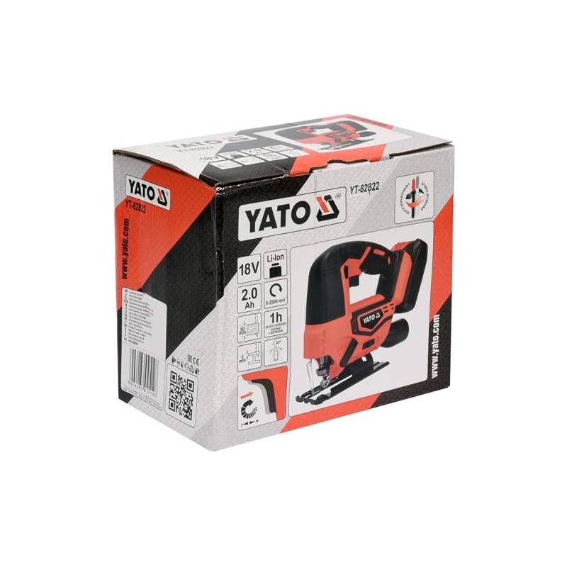 Scie sauteuse YATO 18V. Vitesse : 0-2.500 spm. Course : 20 mm. Pendule. Profondeur de coupe : 50 mm dans le bois, 5 mm dans le métal. Fonction de soufflage de poussière. Base réglable de 0-45 degrés. Guide de coupe parallèle inclus. 1 lame de 75 mm pour bois inclus. Batterie 2,0 Ah. Temps de charge : 60min.