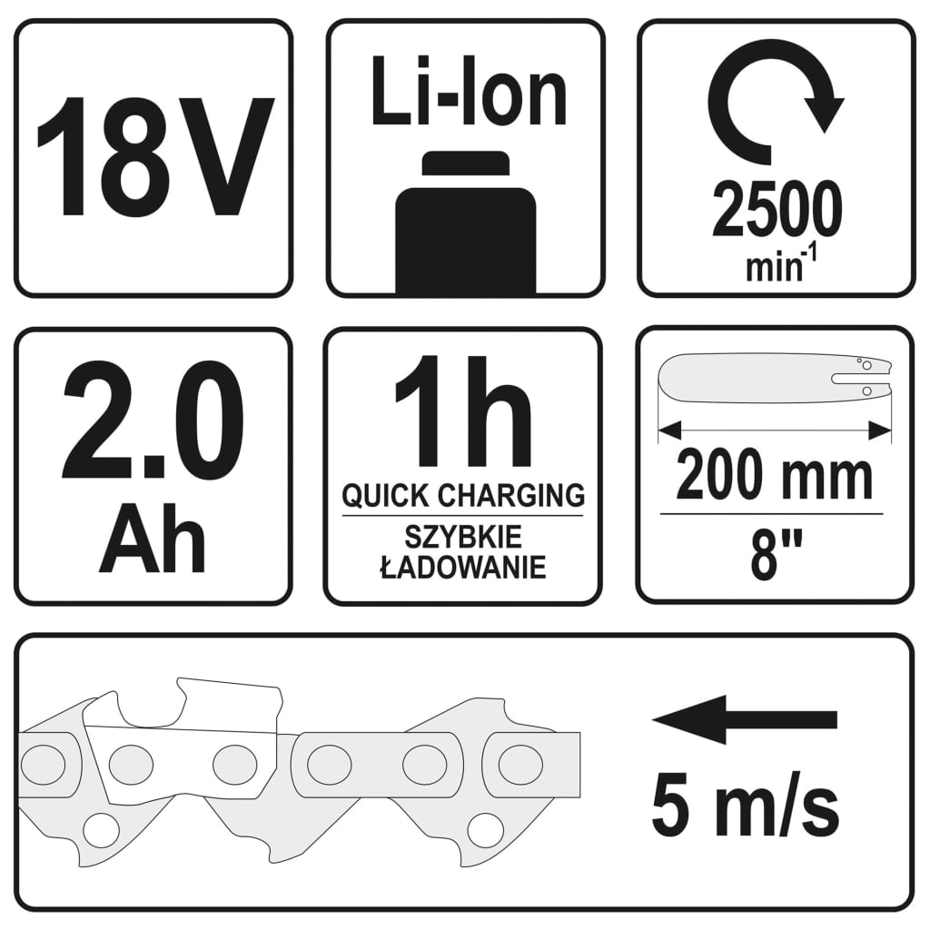 Tronçonneuse télescopique YATO de 18 V. Scie à chaîne. Vitesse de 2.500 tours / minute. Taille de la chaîne de 8" ou 20.32 cm. Système anti-vibration. Système anti-retour. Le pas de la chaîne est de 3/8 de pouce soit de 0.95 cm. Taille du guide 8 pouces soit 20.32 cm. Vitesse linéaire de la chaîne : 5 m/ s. Consommation d'huile : 3 ml / min. Teneur en huile : 60 ml. Arbre télescopique. Extension de 1,96 m - 2,8 m. Bandoulière. Batterie : 2,0 Ah, temps de charge: 60min.
