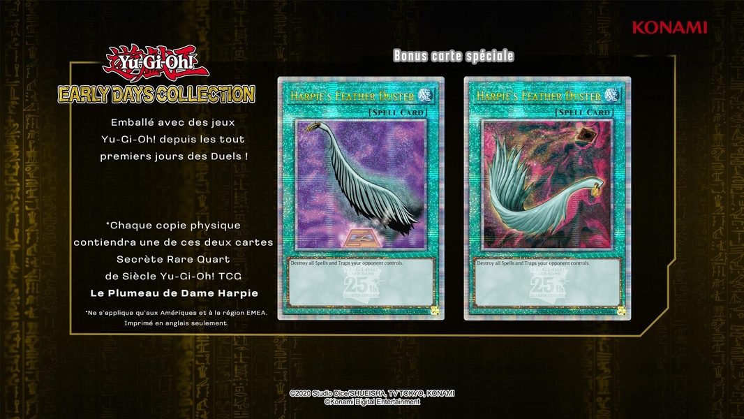Remontez le temps avec une vaste collection de jeux rétro des débuts de Yu-Gi-Oh! comprenant une sélection emblématique de titres de l'ère Game Boy, y compris des jeux sortis uniquement au Japon. Faites un duel aux côtés de vos vieux amis alors que les superstars de l'anime original Yu-Gi-Oh! Duel Monsters reviennent. Cette compilation classique couvre les jeux de cartes de stratégie, les RPG et bien plus encore. - CARTE BONUS EXCLUSIVE \"QUARTER CENTURY SECRET RARE\" Balayez la concurrence avec le Plumeau de Dame Harpie, une carte puissante qui peut détruire toutes les cartes Magie et Piège contrôlées par votre adversaire. Dans le cadre du 25ème anniversaire du JEU DE CARTES À JOUER Yu-Gi-Oh!, cette carte emblématique est imprimée en tant que \"Quarter Century Secret Rare\", ce qui en fait une carte à collectionner unique.