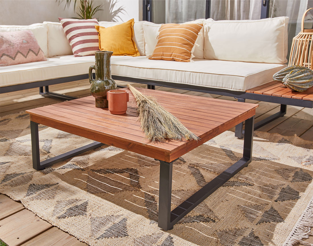 | Libellé | Yulara - salon bas d'angle de jardin 5 places - bois, métal et coussins beiges |