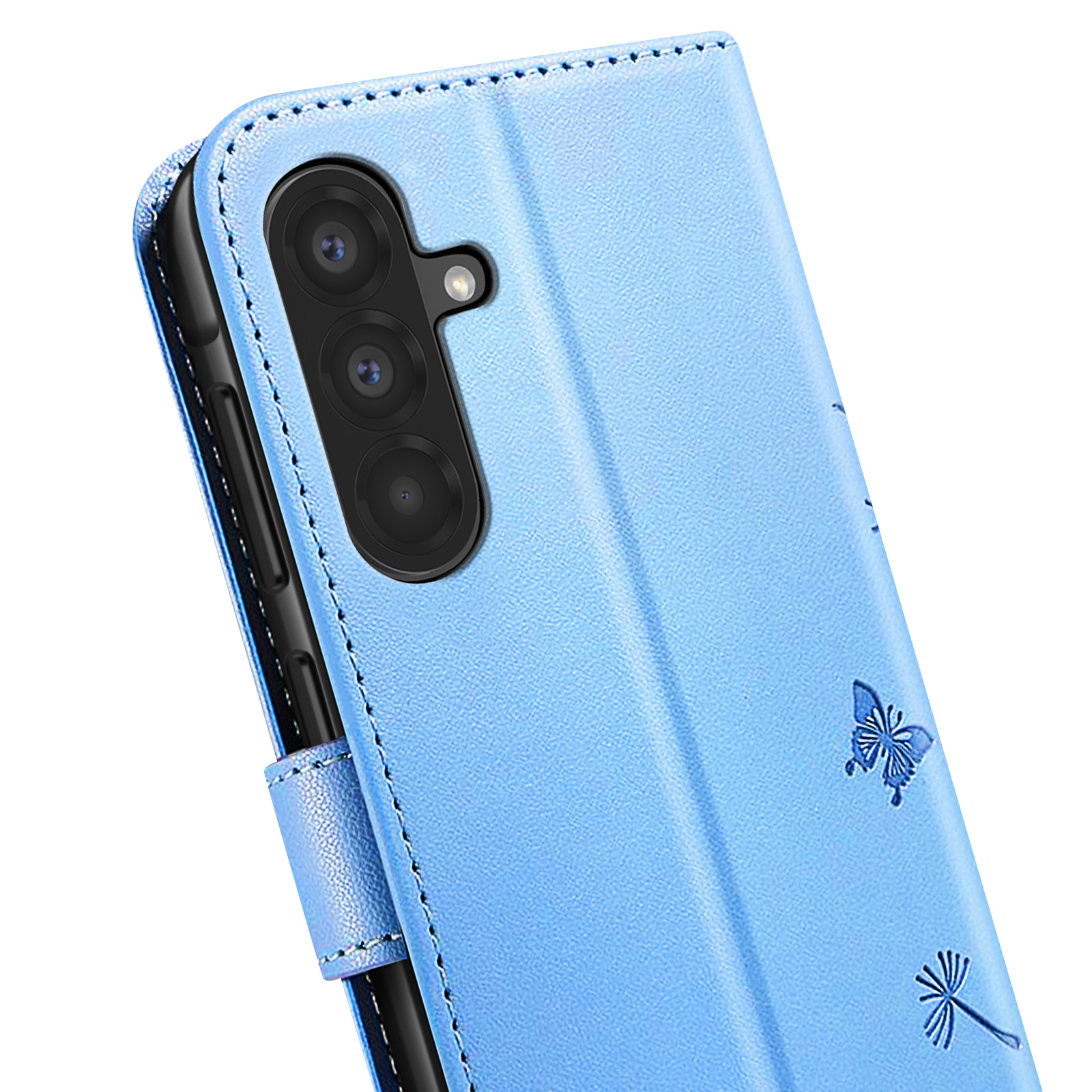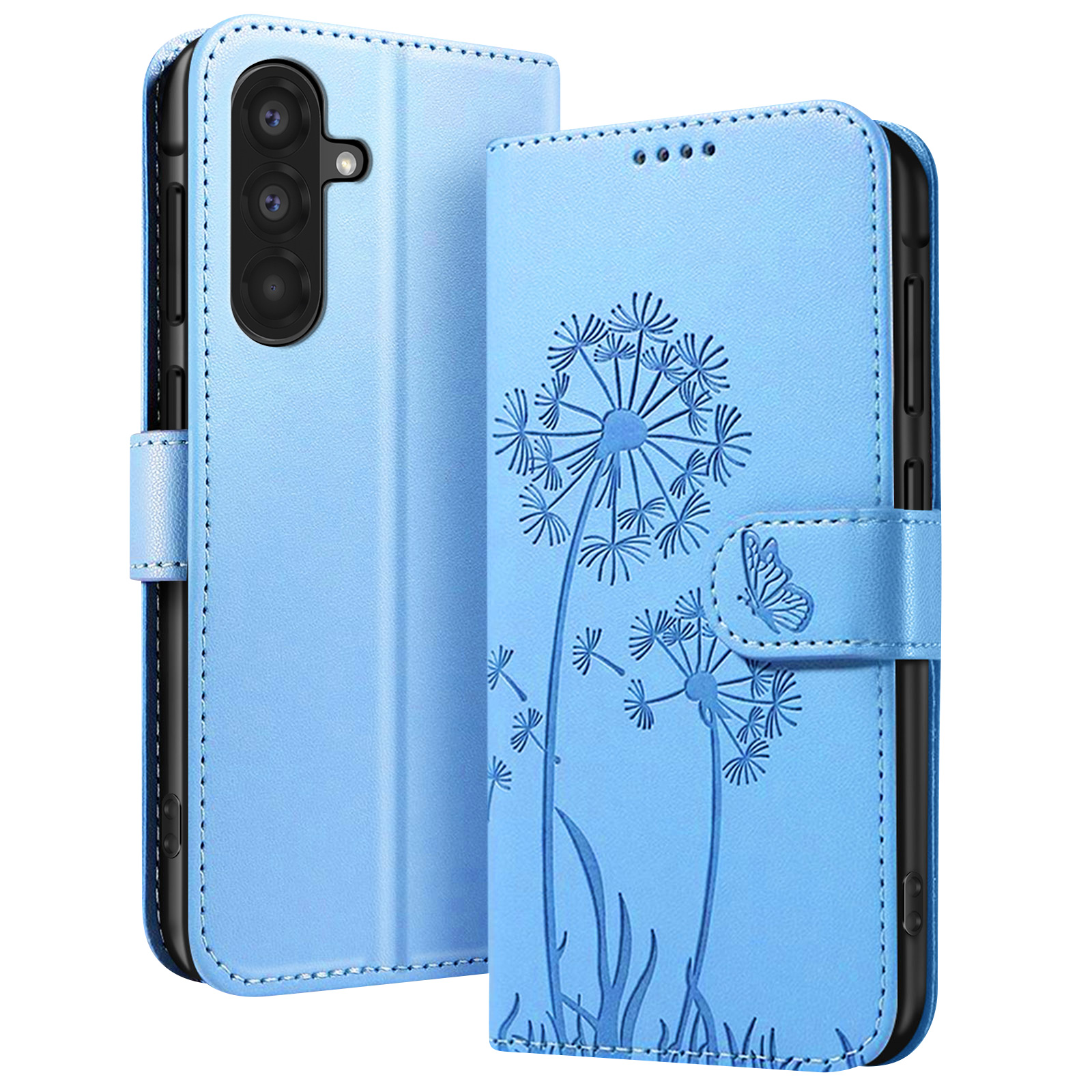 Protégez votre Samsung Galaxy A56 / A36 avec élégance grâce à cet étui portefeuille Zanaé bleu clair. Son PU haut de gamme est décoré d'un motif pissenlit et papillon gravé pour un style raffiné. Il offre une protection complète avec coque intérieure souple, fermeture magnétique, rangements pour cartes et billets, ainsi qu'un support vidéo pratique pour vos contenus multimédia.