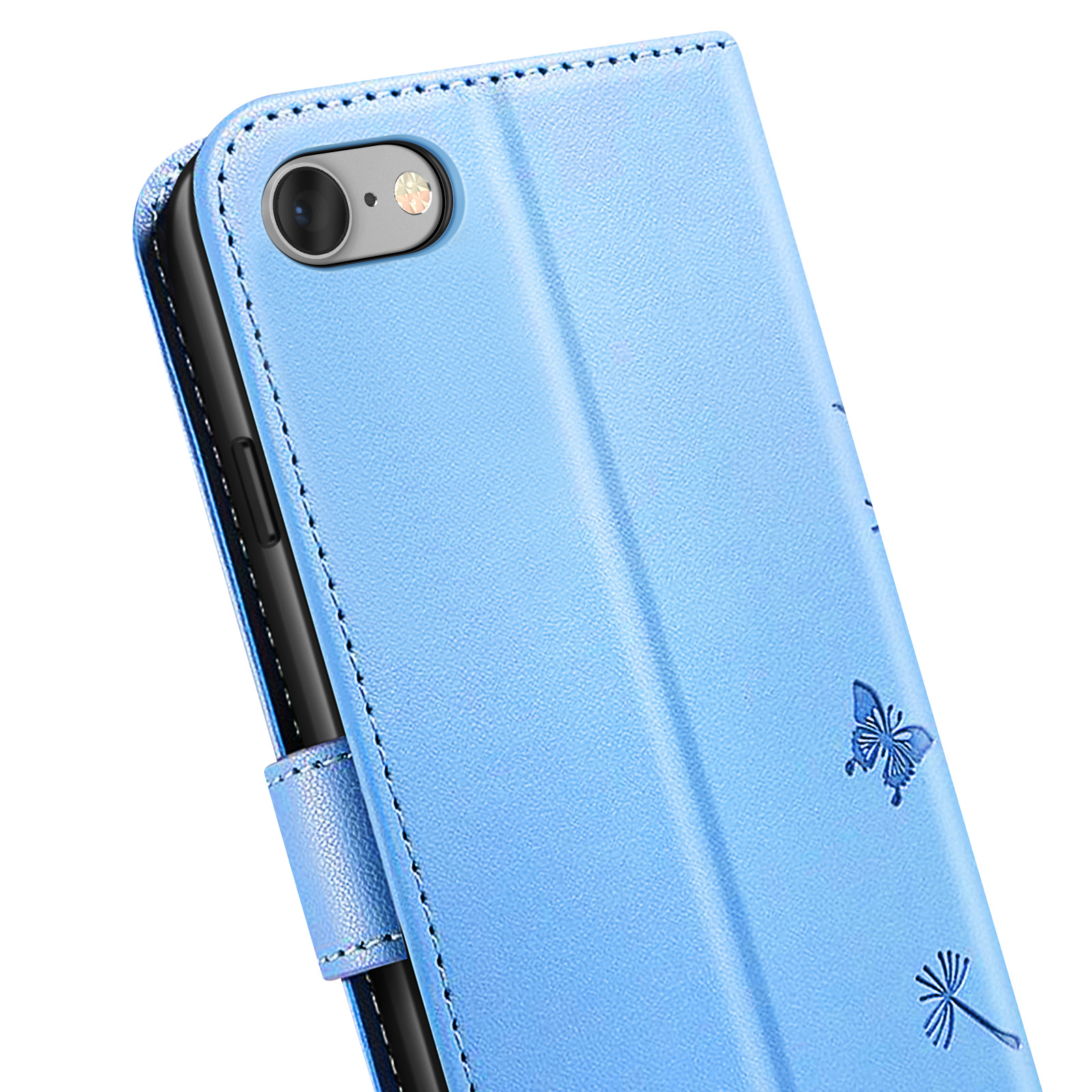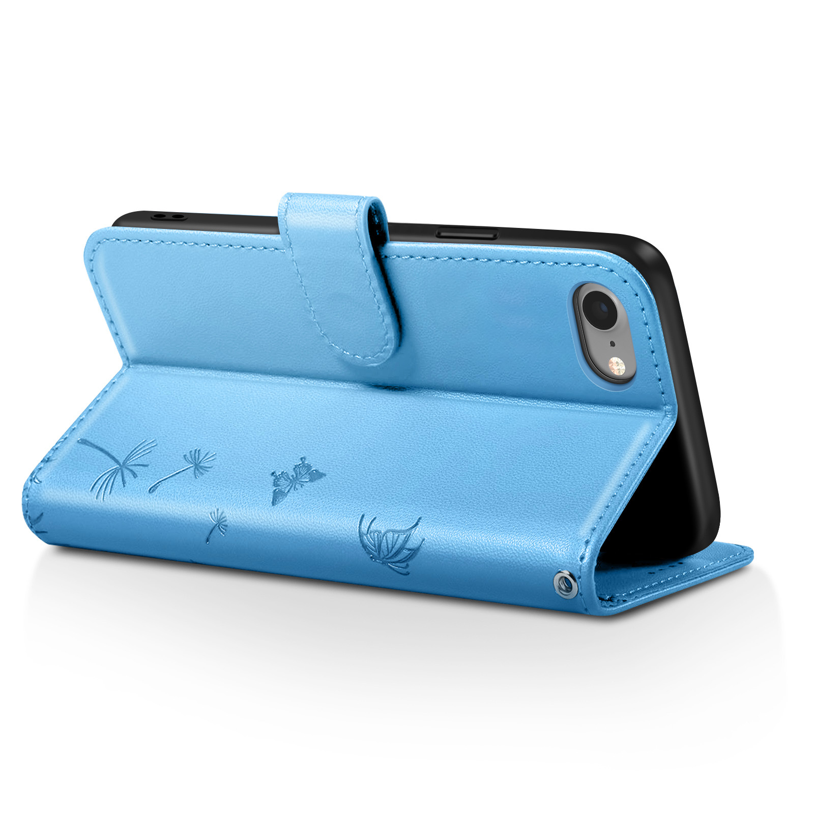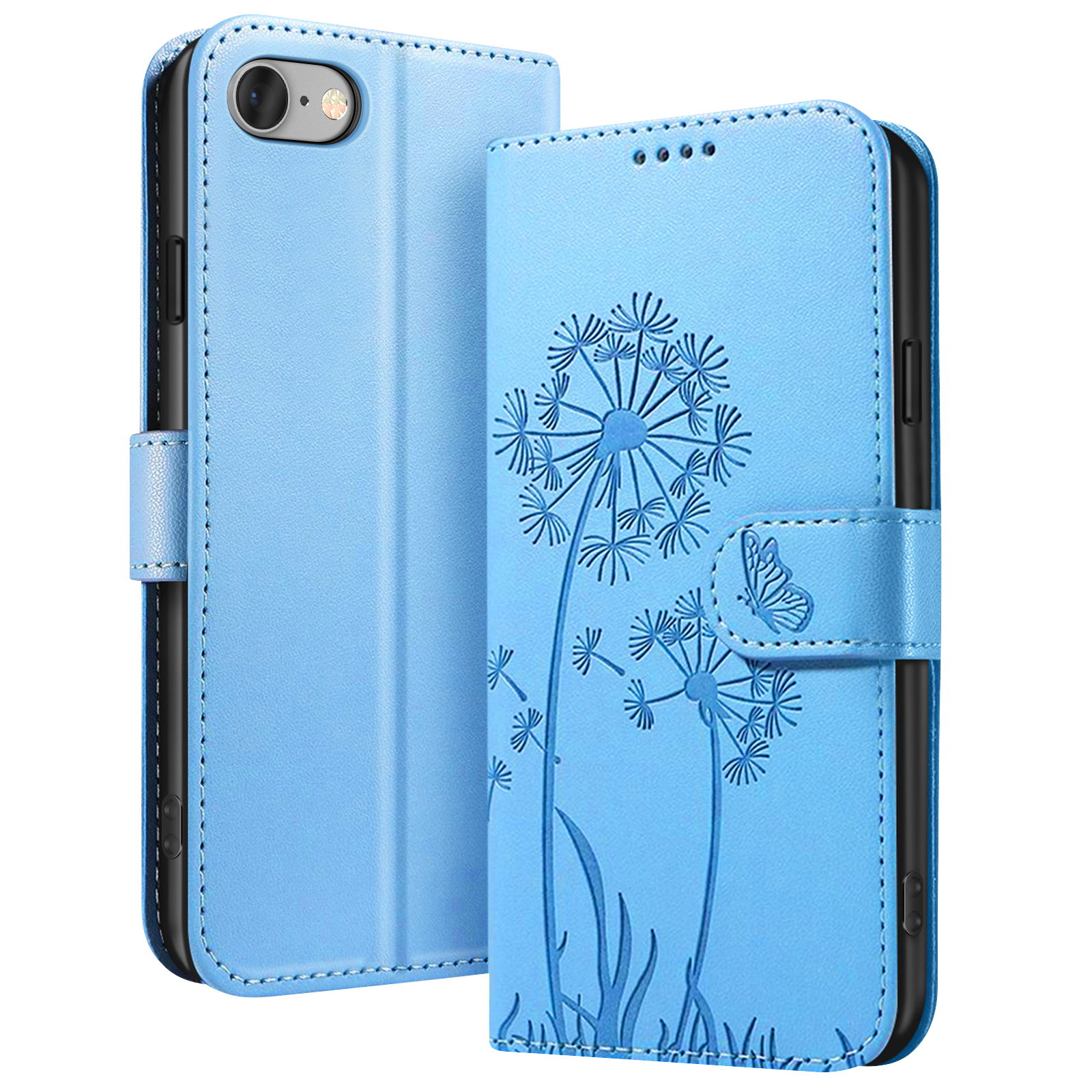 Protégez votre iPhone 7 / 8 / SE / SE 2022 avec élégance grâce à cet étui portefeuille Zanaé bleu clair. Son PU haut de gamme est décoré d'un motif pissenlit et papillon gravé pour un style raffiné. Il offre une protection complète avec coque intérieure souple, fermeture magnétique, rangements pour cartes et billets, ainsi qu'un support vidéo pratique pour vos contenus multimédia.