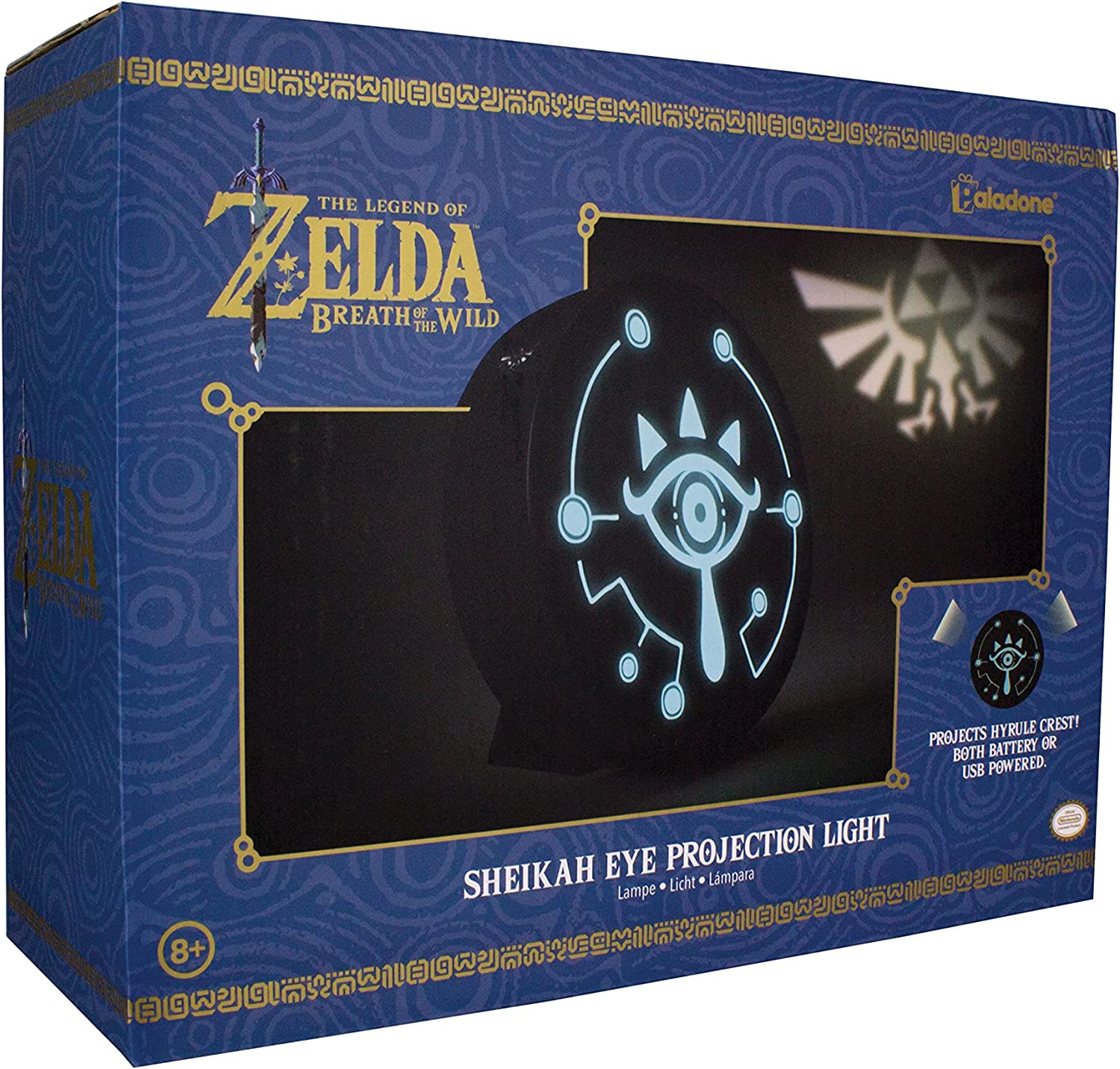 | Plus produit | Projette le symbole de l'œil Sheikah en lumière bleutée; alimentation USB ou 3 piles AA (non fournies); peut être posé ou installé au mur; produit officiel sous licence Zelda |