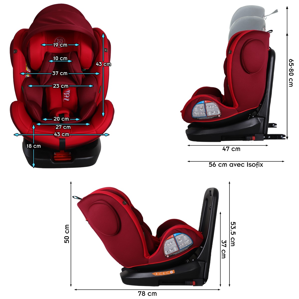 ZELI - Siège-auto i-Size évolutif pivotant à 360° - Isofix et top tether - de 40 à 150 cm. De la naissance jusqu'à 150 cm (environ 10 ans). Plusieurs coloris disponibles. CARACTÉRISTIQUES : Conforme à la nouvelle norme de sécurité ECE R129/03 et certifié i-Size. Ce siège-auto pivote latéralement à 360° pour faciliter l'installation de l'enfant dans le siège. Protections latérales renforcées pour protéger au maximum la tête, le corps et les hanches. Appui-tête ajustable grâce à sa poignée placée à l'arrière de la têtière. Siège-auto inclinable sur 3 positions (de assise à semi-couchée). Réducteurs en mousse à mémoire de forme amovibles. Tissu doux et respirant pour le confort de l'enfant. Housse amovible et lavable en machine à 30°. Harnais de sécurité à 5 points (amovible pour les enfants plus âgés). La canopy intégrée (pare-soleil) est rétractable et amovible pour protéger votre enfant du soleil. Ce siège-auto peut être installé face ou dos à la route. Il est équipé des systèmes de fixations ISOFIX et TOP TETHER. La position dos à la route est obligatoire jusqu'à 15 mois et 9 kg. De 40 à 105 cm (0-13 kg) : fixation dos à la route avec le système ISOFIX et la fixation TOP TETHER. Utilisation du harnais 5 points pour l'attache. De 76 à 105 cm (9-18 kg) : fixation face à la route avec le système ISOFIX et la fixation TOP TETHER. Utilisation du harnais 5 points pour l'attache. De 100 à 150 cm (15-36 kg) : fixation face à la route avec le système ISOFIX et/ou la ceinture de sécurité. Utilisation de la ceinture sécurité pour l'attache. DIMENSIONS ET POIDS : Dimensions : L 43 x P 47 x H 65-80 cm. Poids : 11 kg. Garantie : 2 ans.