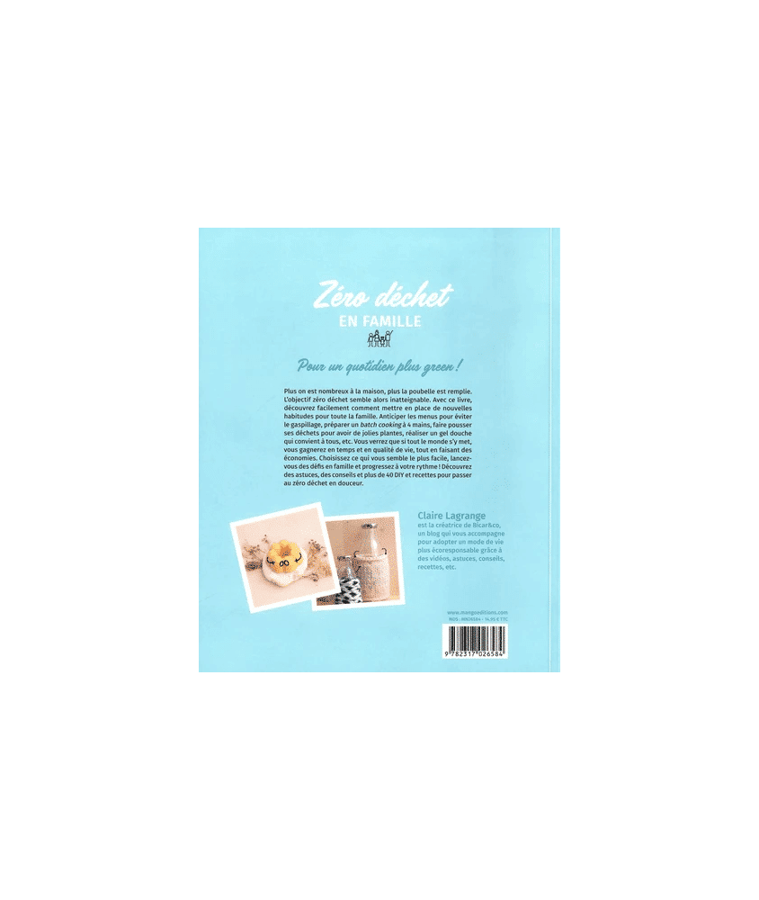 Plus on est nombreux à la maison, plus la poubelle est remplie. L’objectif zéro déchet semble alors inatteignable. Avec ce livre, découvrez facilement comment mettre en place de nouvelles habitudes pour toute la famille. Anticiper les menus pour éviter le gaspillage, préparer un batch cooking à 4 mains, faire pousser ses déchets pour avoir de jolies plantes, réaliser un gel douche qui convient à tous, etc. Vous verrez que si tout le monde s’y met, vous gagnerez en temps et en qualité de vie, tout en faisant des économies. Choisissez ce qui vous semble le plus facile, lancez-vous des défis en famille et progressez à votre rythme ! Découvrez des astuces, des conseils et plus de 40 DIY et recettes pour passer au zéro déchet en douceur.